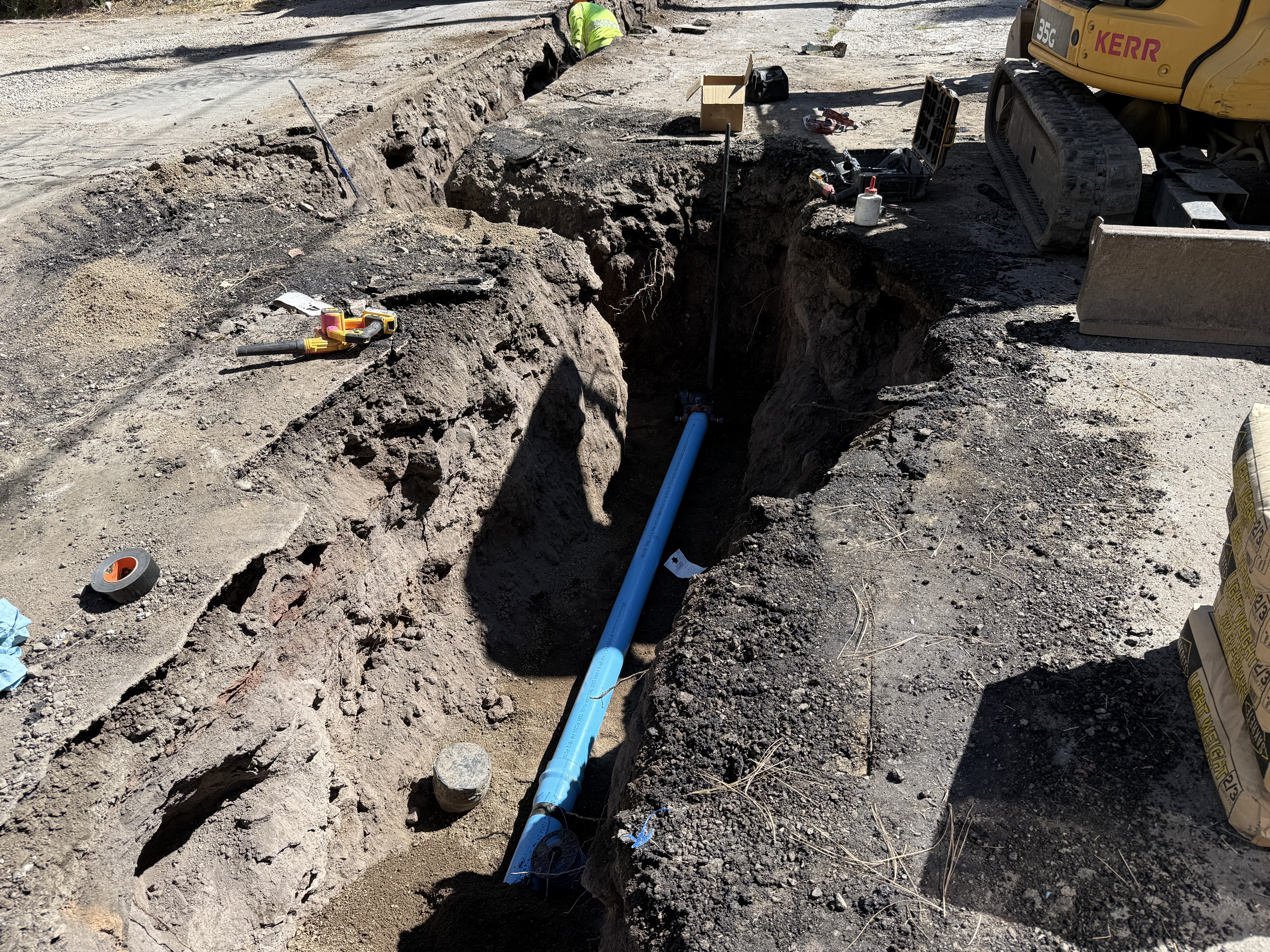 The image depicts an open trench where a blue pipe is being laid. An excavator is positioned near the trench, and various hand tools are visible on the ground around the trench. The soil is disturbed with loose gravel and dirt on the sides. No workers are actively handling the materials in the frame.