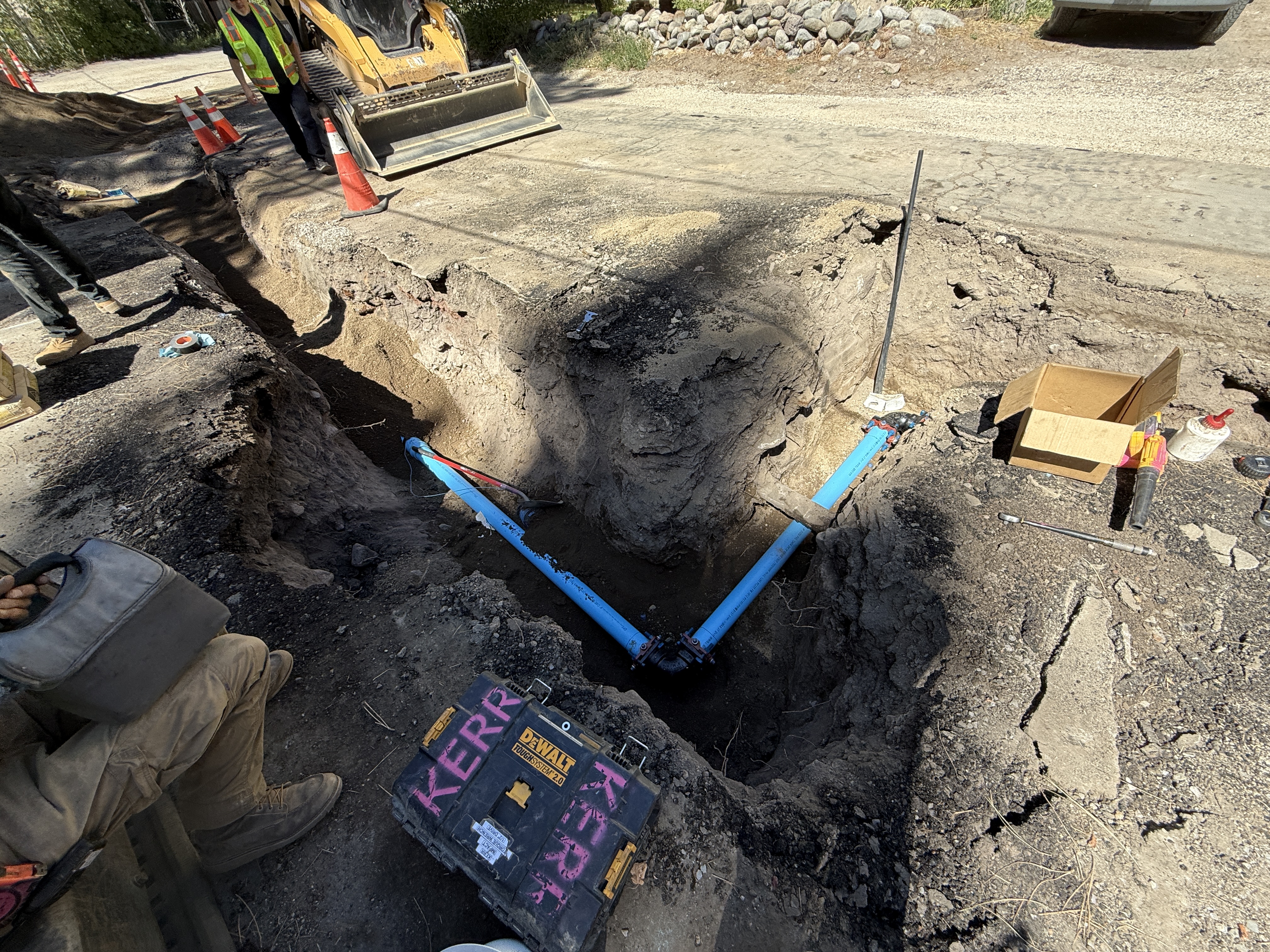 The image shows a trench with a blue pipe section installed within it. The trench is surrounded by loose soil and the surface shows signs of excavation. There is a piece of heavy equipment, likely an excavator, in the background, indicating ongoing or recent excavation work. Several construction cones and tools are visible around the trench area, suggesting active construction. Workers are nearby, wearing standard PPE.