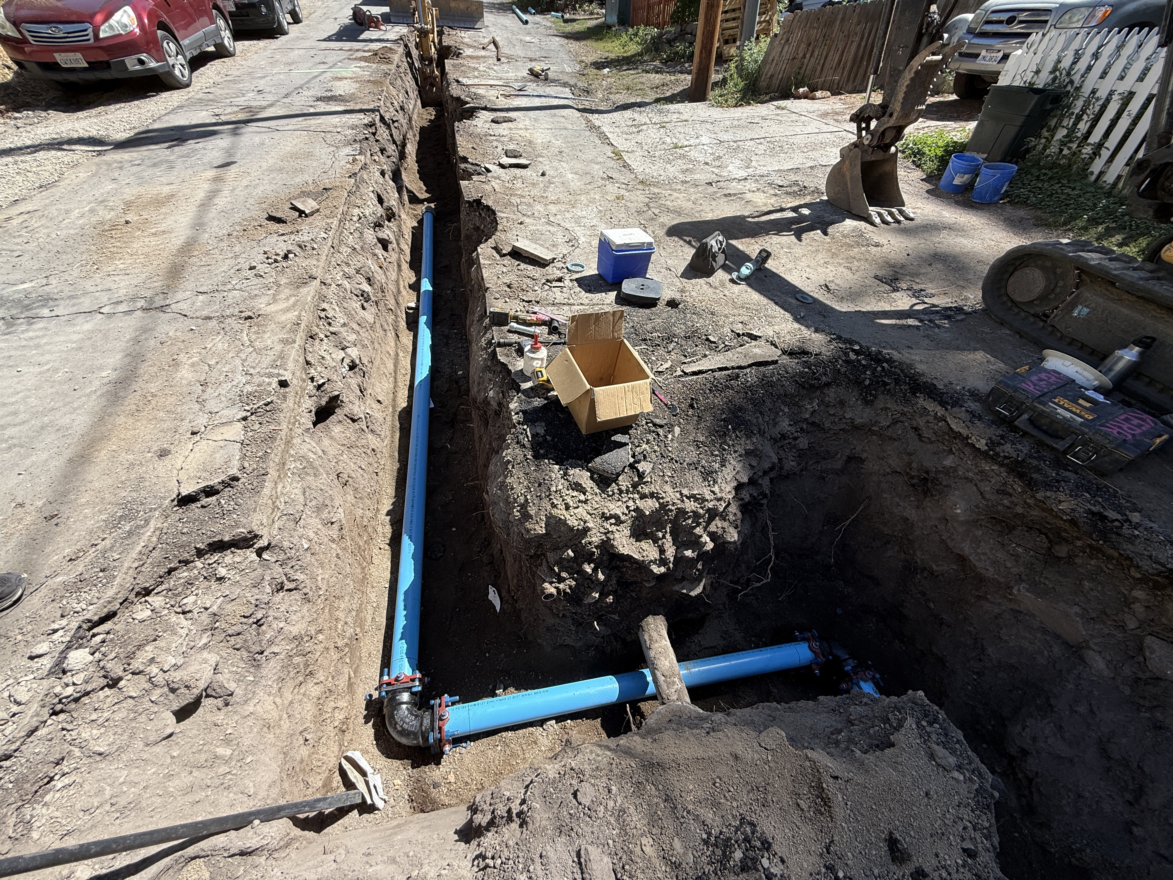 dirt and asphalt surface with open trench clear day, well-lit conditions equipment and tools staged adjacent to trench