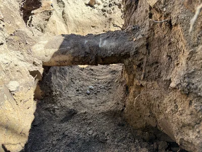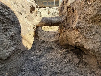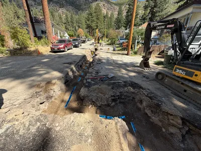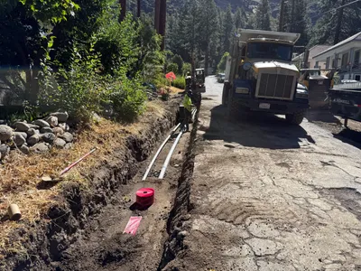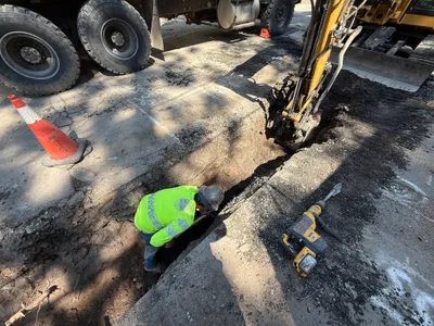The image shows a trench running parallel to a residential street with a blue pipeline installed at the bottom. An excavator is positioned alongside the trench, indicating active trenching work. Construction supplies and tools are visible near the trench edge. A worker in a hi-vis vest is present nearby, suggesting active site work. The scene is well-lit under clear weather conditions.