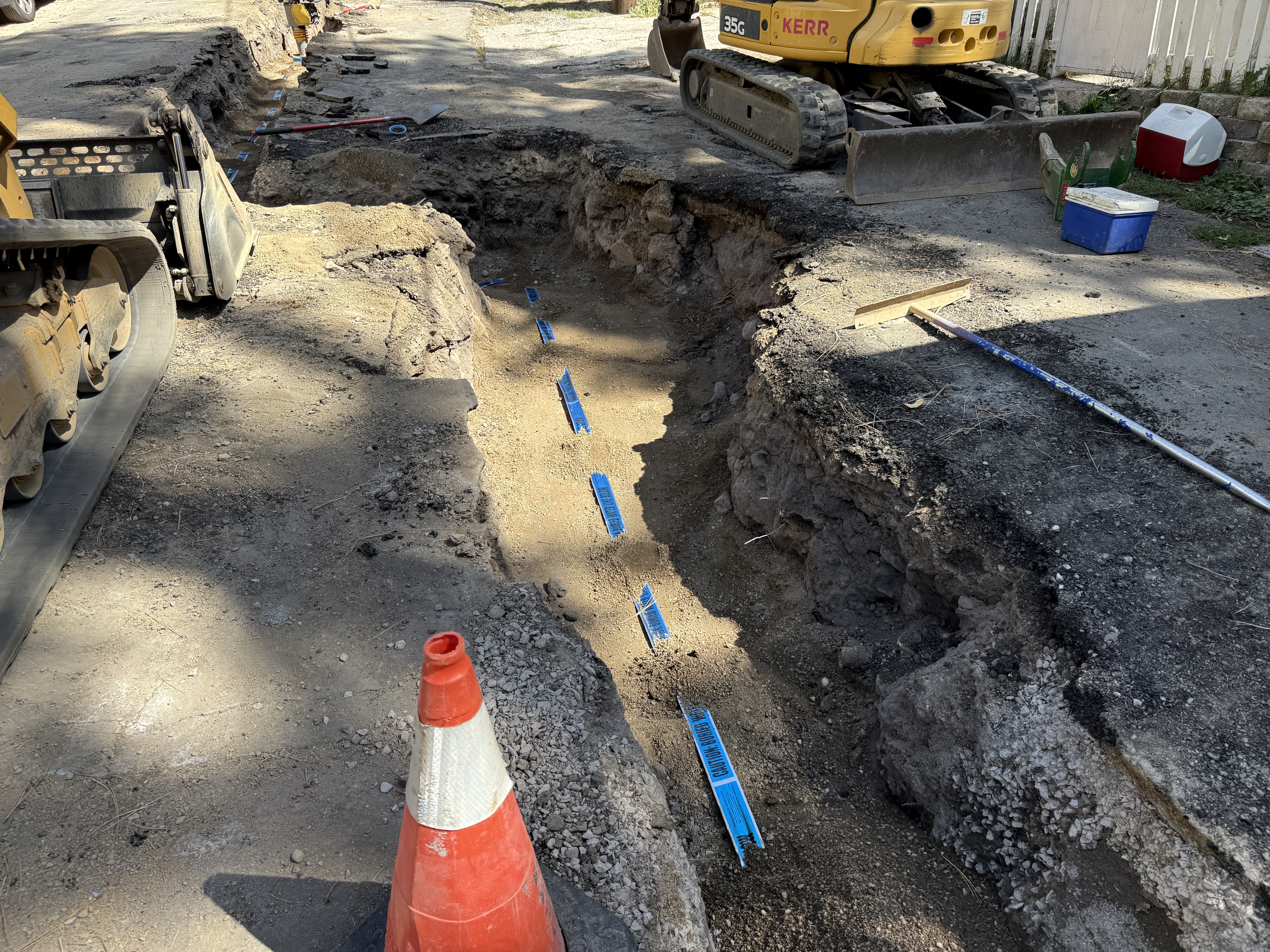 The image shows a trench with exposed soil in a street-like environment, accompanied by an excavator and a bulldozer nearby. Blue marking tape is visible at the bottom of the trench. An orange traffic cone is positioned in the foreground as a safety marker. The machinery appears actively involved in trenching work, and the trench is unshored.