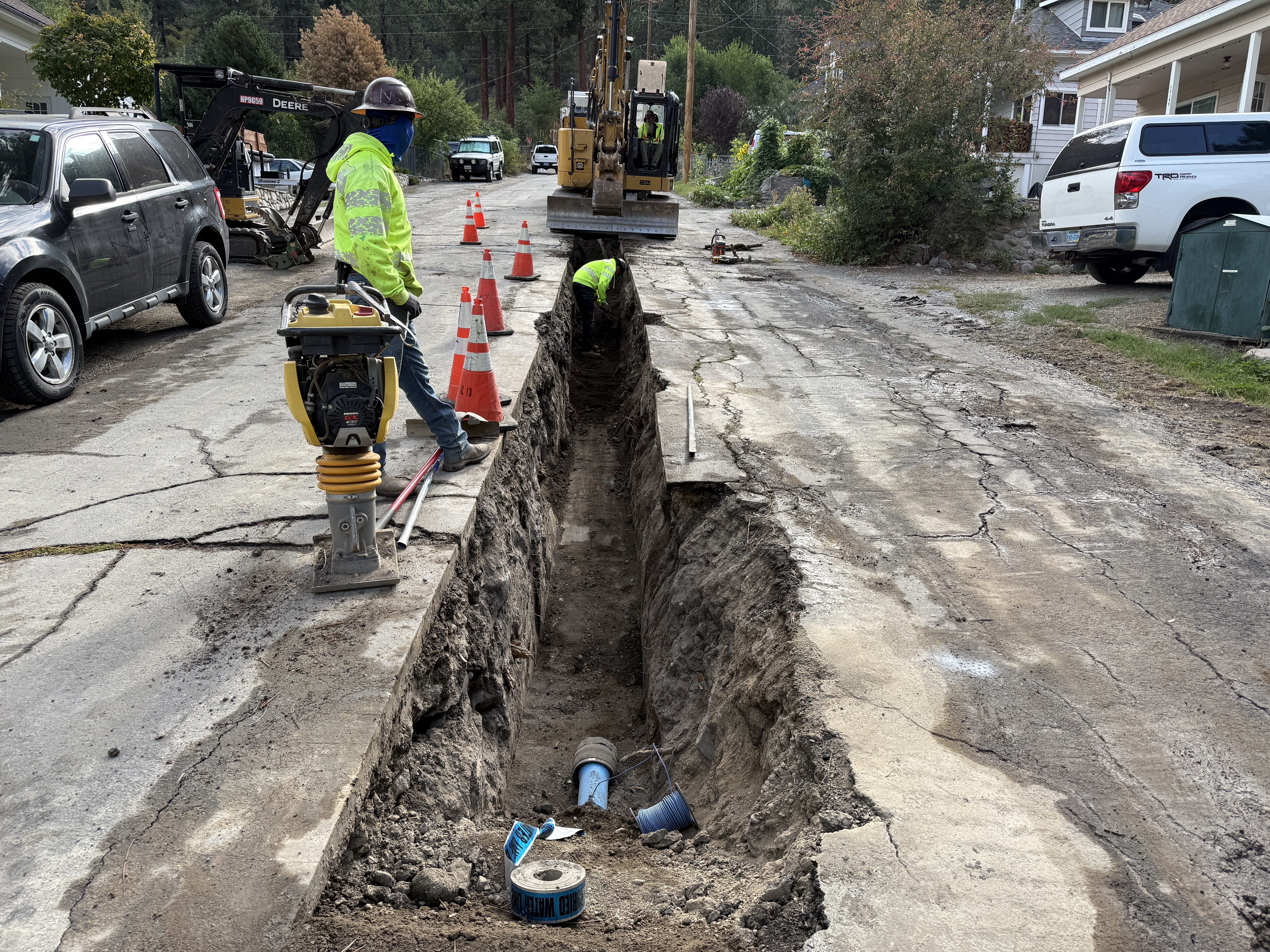 The image shows an open trench running along a road with heavy machinery positioned nearby. Workers are wearing safety gear such as hard hats, hi-vis vests, and work boots. Cones are placed along the trench for safety, and piping is visible inside the trench. Several vehicles are parked along the street.