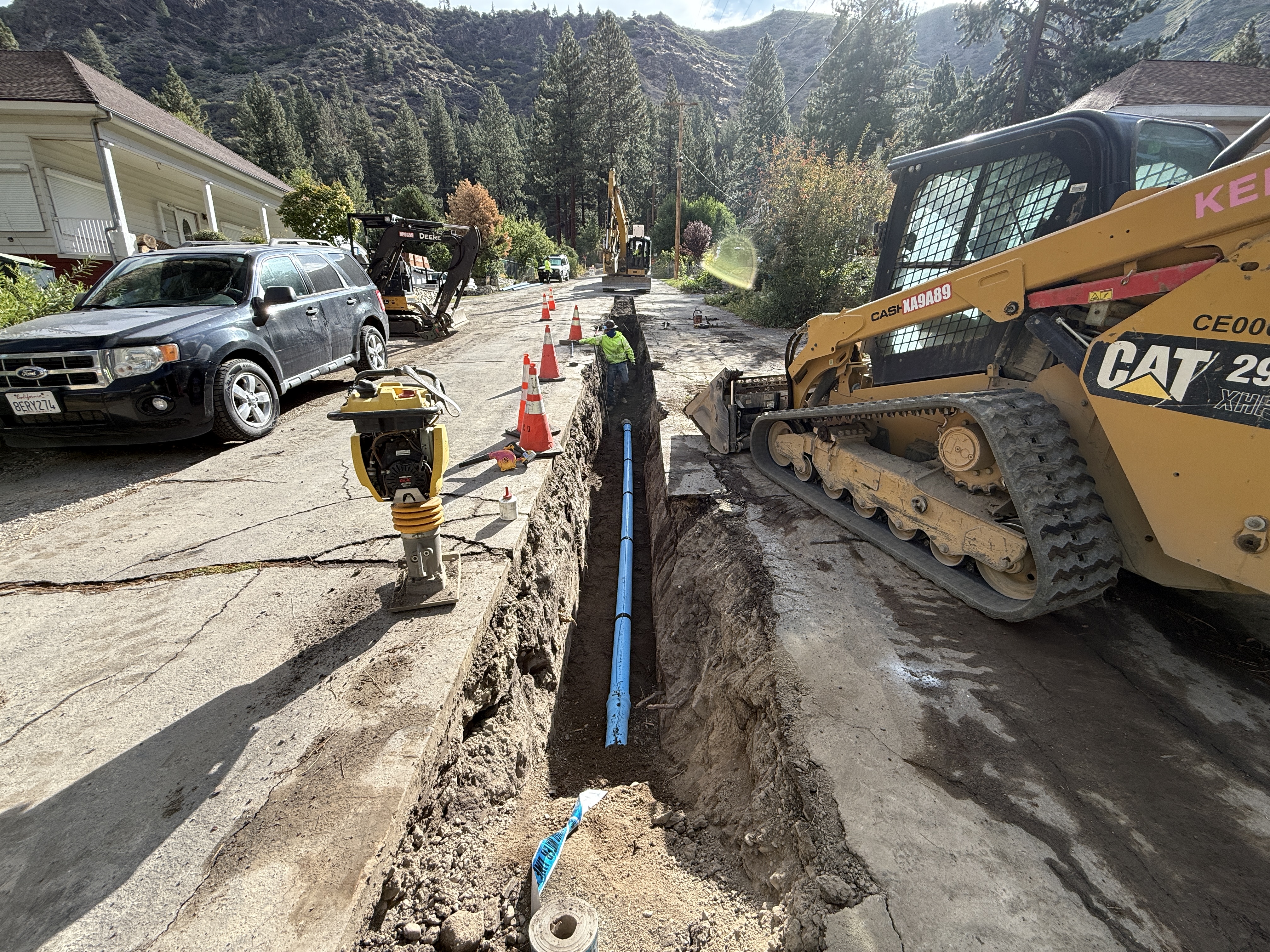 The image shows a trench being dug along a roadway in a residential area, with a blue pipe being laid into the trench. A skid steer loader is positioned near the trench, and there is a worker inside the trench. The surroundings include a parked car and several construction cones marking the work zone.