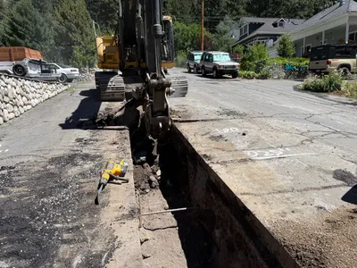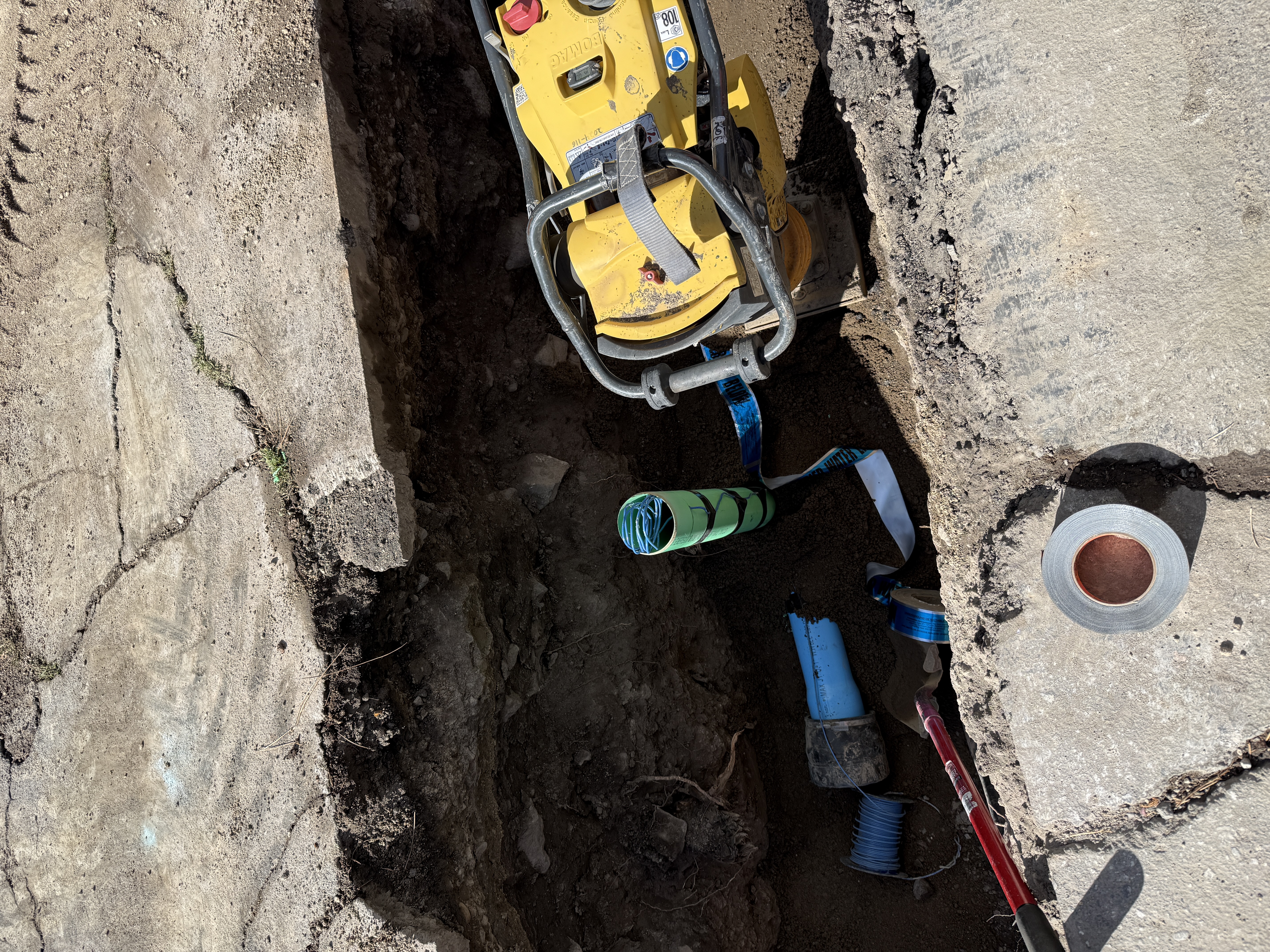 A trench is open in the foreground, with a yellow compactor near the trench edge. Several pipes, including a blue one, are visible within the trench along with a roll of tape on the ground surface. There is loose soil around the trench, possibly indicating recent excavation work. The compactor suggests potential backfill or soil compaction activity.