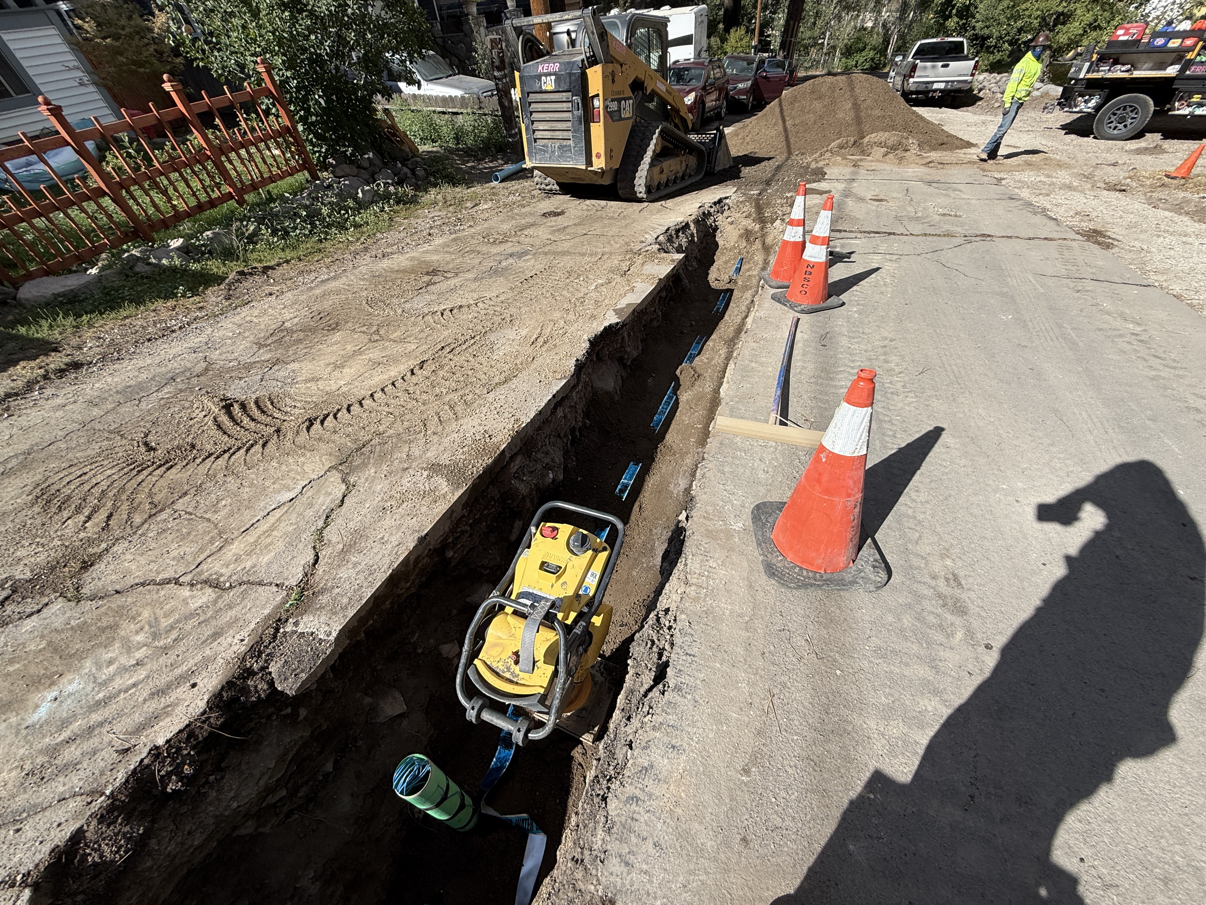 The image features a trench along a paved road with visible pipes inside. A compact excavator is positioned on the left side of the trench. Traffic cones are placed along the trench for safety. A person wearing a hi-vis vest is standing nearby, indicating an active worksite. The trench is lined with a partially visible blue pipe, suggesting ongoing pipeline installation.