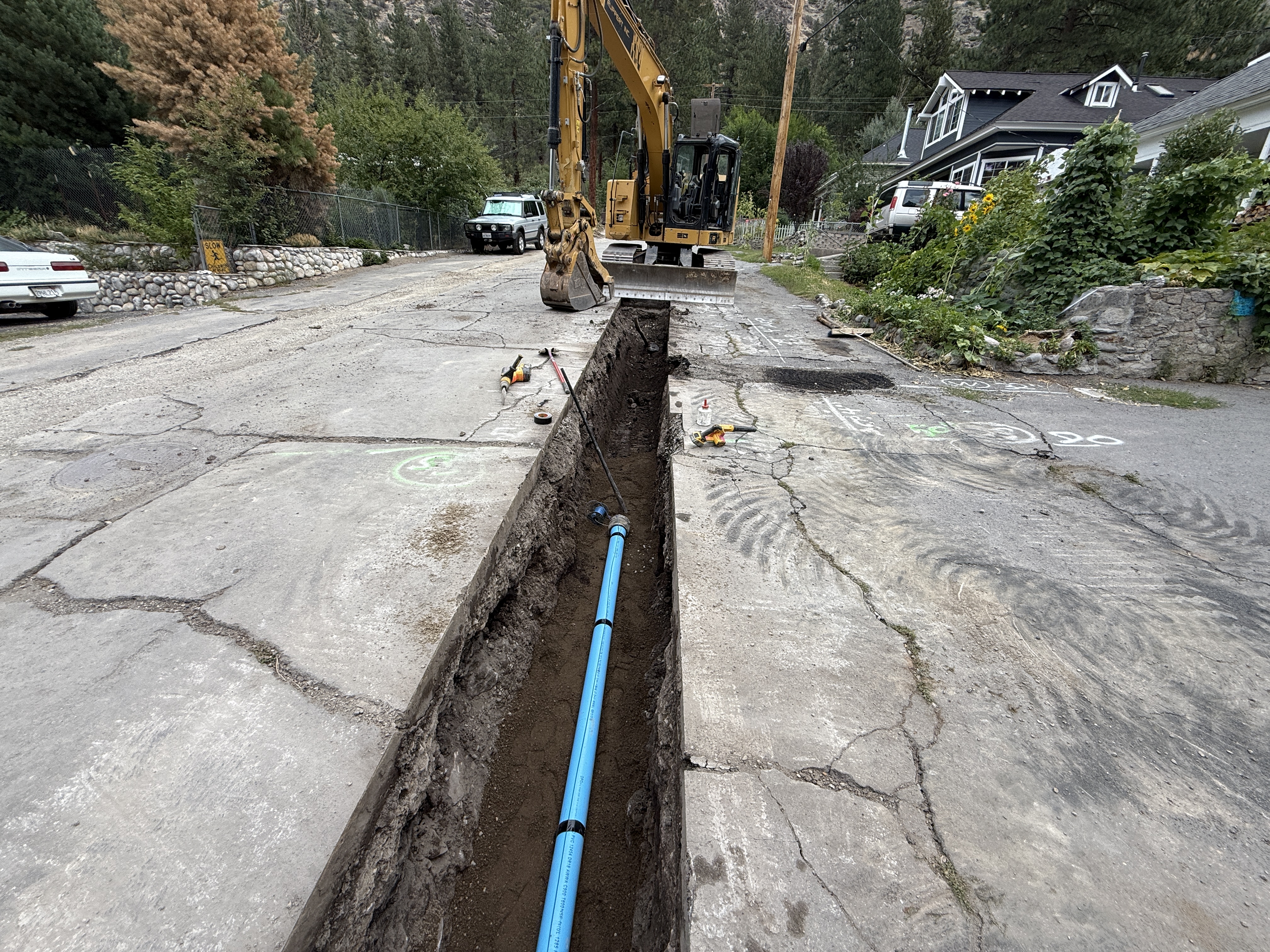 A trench is dug along a residential street where a blue pipeline is installed. An excavator is positioned near the trench, indicating active trenching work. The trench is open with loose soil around its edges. Nearby utility markings can be seen on the pavement surface.