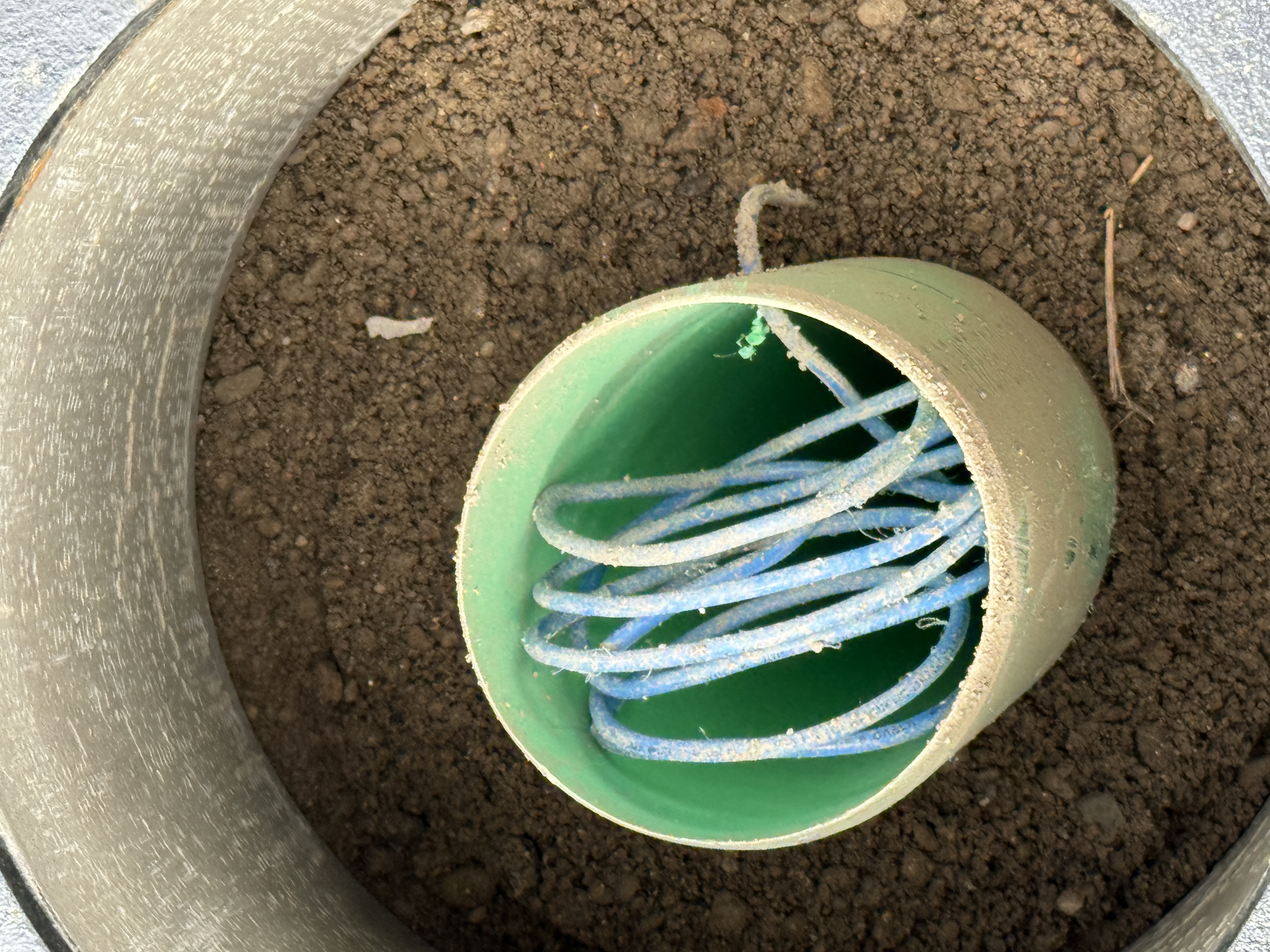 The image shows a blue rope coiled inside a green pipe, which is embedded within a section of exposed soil, possibly indicating some preparatory work. The surrounding environment consists predominantly of loose dirt. No active work or machinery is visible in the photo.