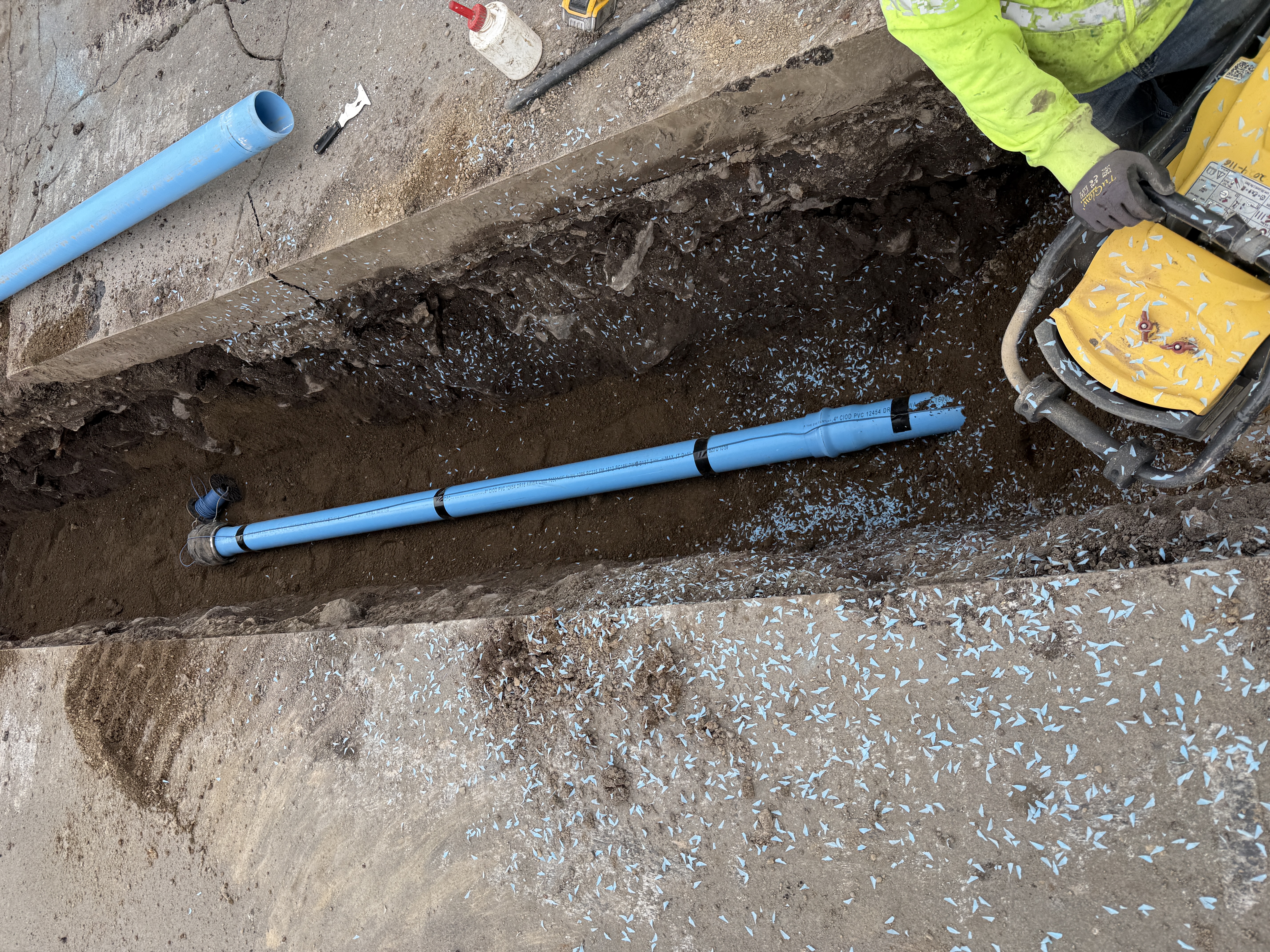 The image shows a blue pipeline being laid in an open trench. A person in a high-visibility jacket is operating a compaction machine near the trench. There are blue pipe shavings scattered on the ground, and another section of blue pipe is staged nearby. The trench is in a paved area with loose soil in and around the trench.