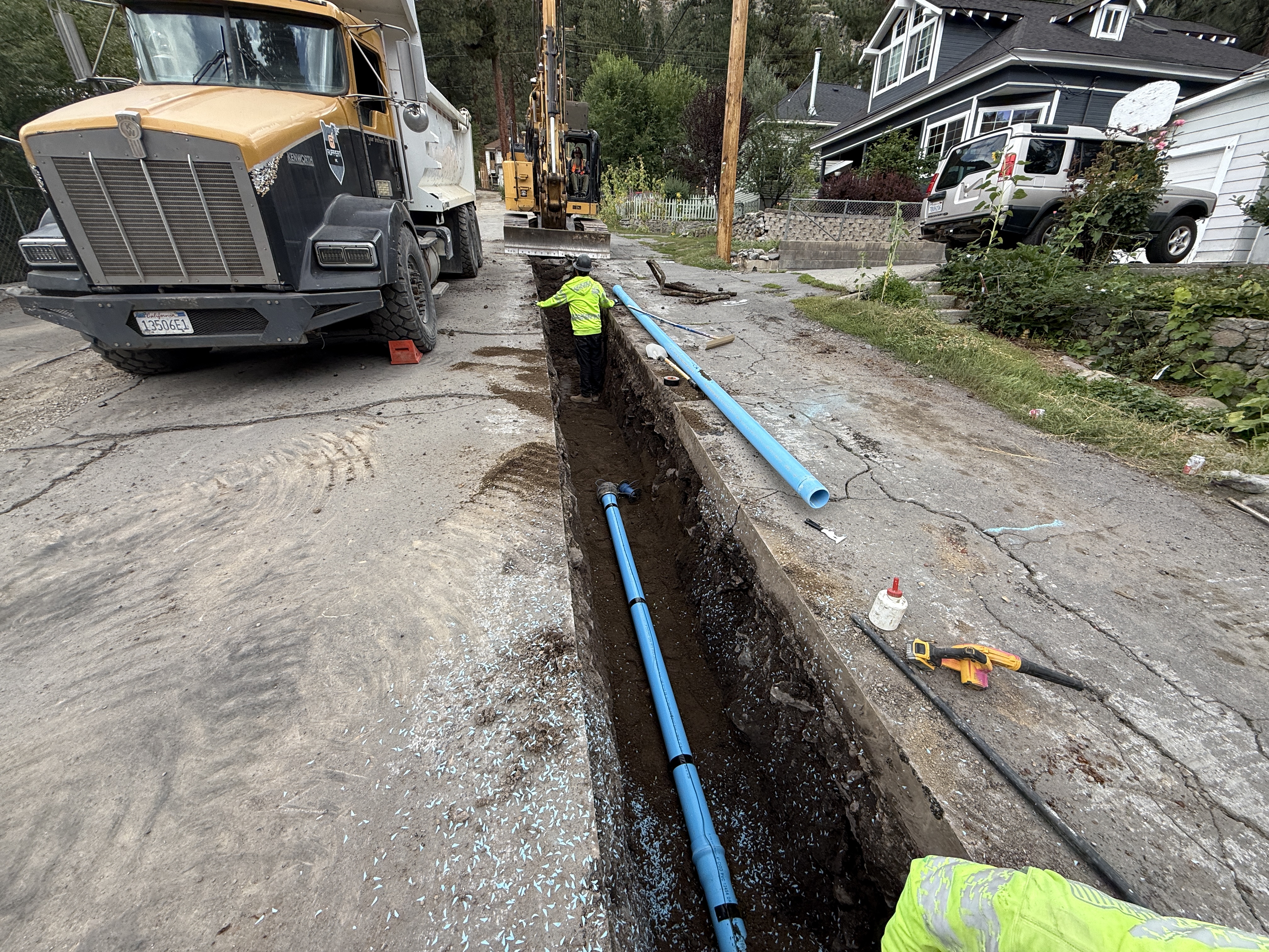 The image shows trenching work with a worker in a hi-vis vest standing in an open trench where blue pipes are being installed. A dump truck and an excavator are positioned beside the trench on the paved street. Hand tools, some blue pipe fittings, and other construction materials are visible near the trench. The area is adjacent to residential houses, and no visible trench protection measures such as trench boxes are in place.