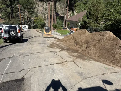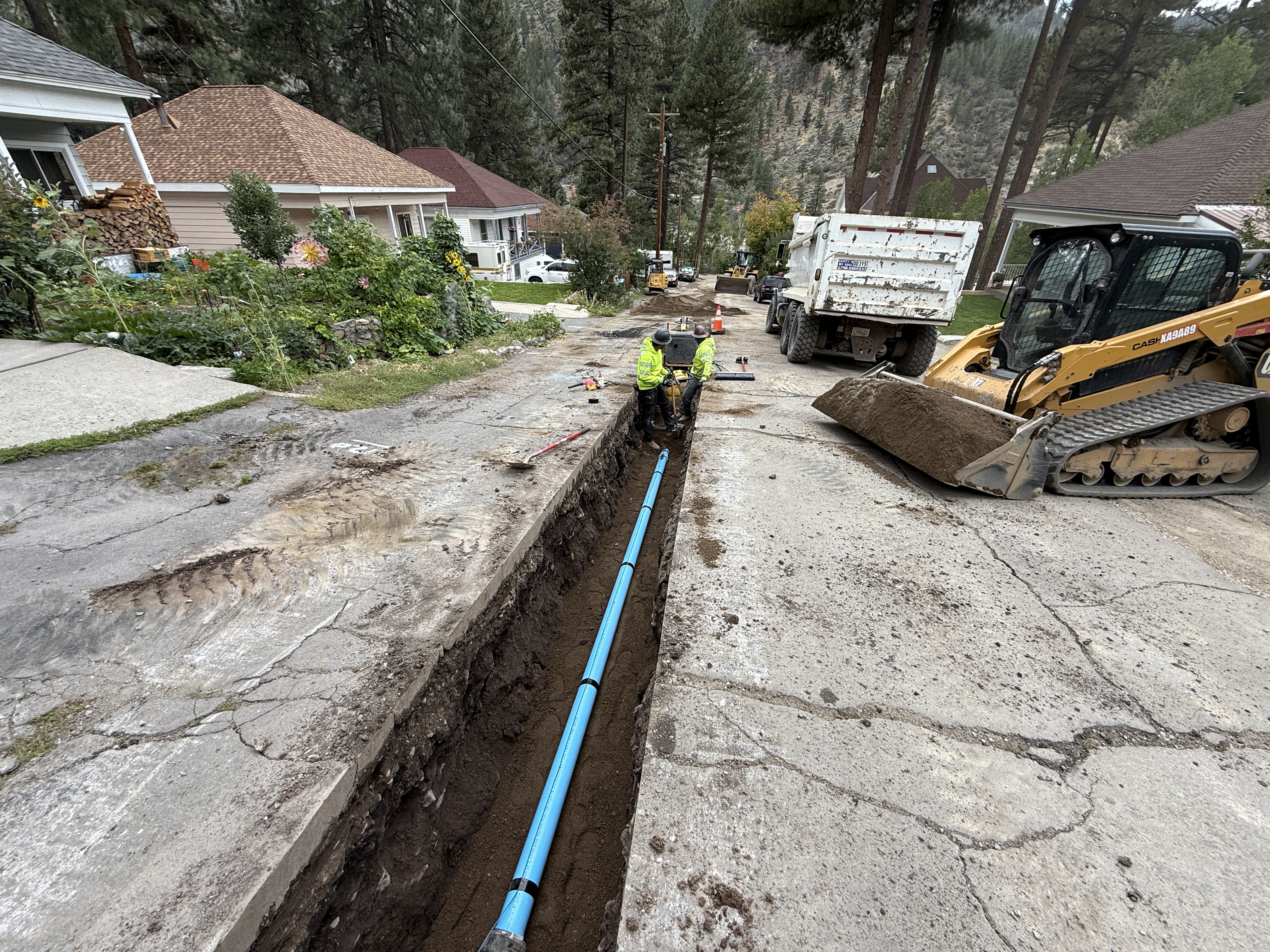 A trench is opened along a cracked residential street with workers installing a blue pipeline inside. A skid steer loader with a bucket is positioned nearby, and a dump truck is parked alongside. Workers in safety gear are actively engaged in the trench, suggesting ongoing pipeline installation work.