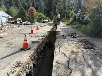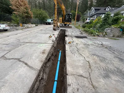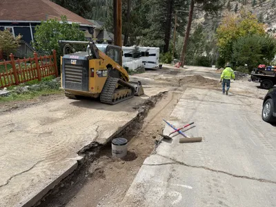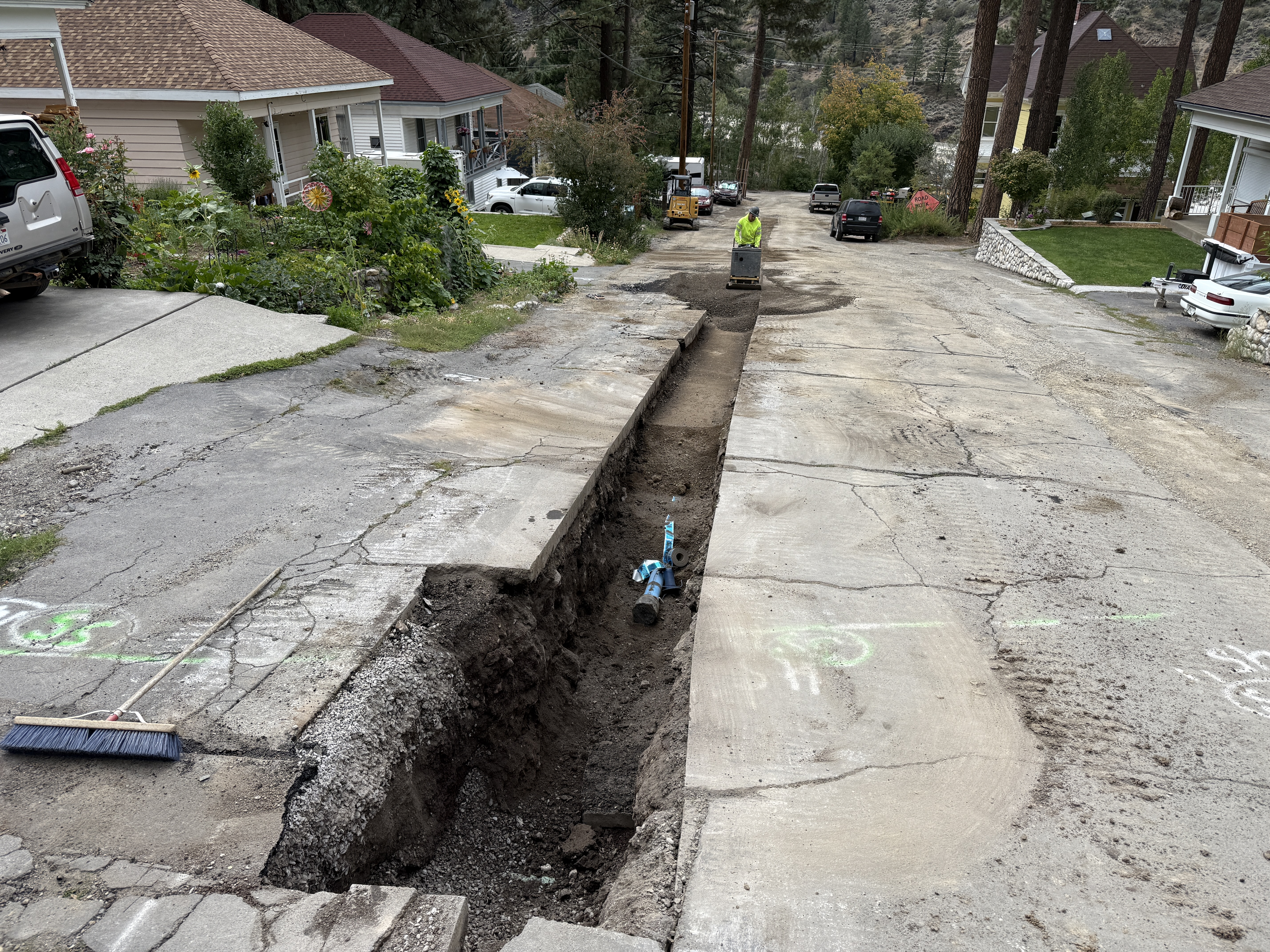 The image shows a trench cut along a residential street with cracked pavement. A person in a hi-vis vest is operating a compactor along the trench. Exposed pipes are visible in the trench, and there are markings on the pavement indicating possible utility locations. The surrounding area includes residential homes, and a broom is placed on the pavement.
