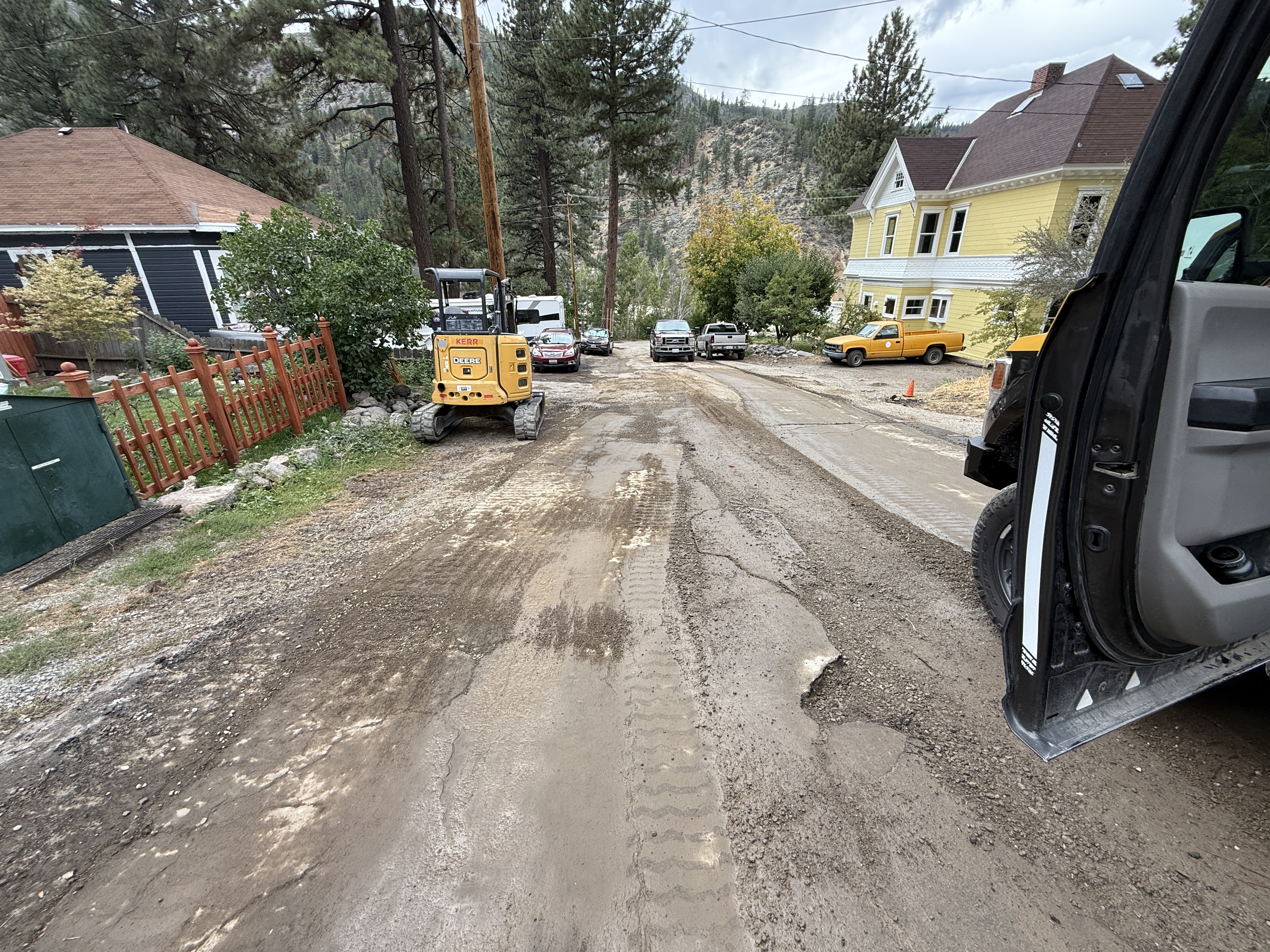 The image shows a partially graded road with visible tire tracks indicating recent work. A compact excavator is parked on the left side of the road and several vehicles are parked toward the background. The surface appears to be muddy or partially cleared, with no visible signs of active work happening. Equipment and vehicles are positioned along the roadway, suggesting ongoing site preparation or maintenance work.