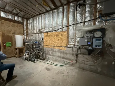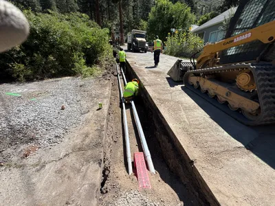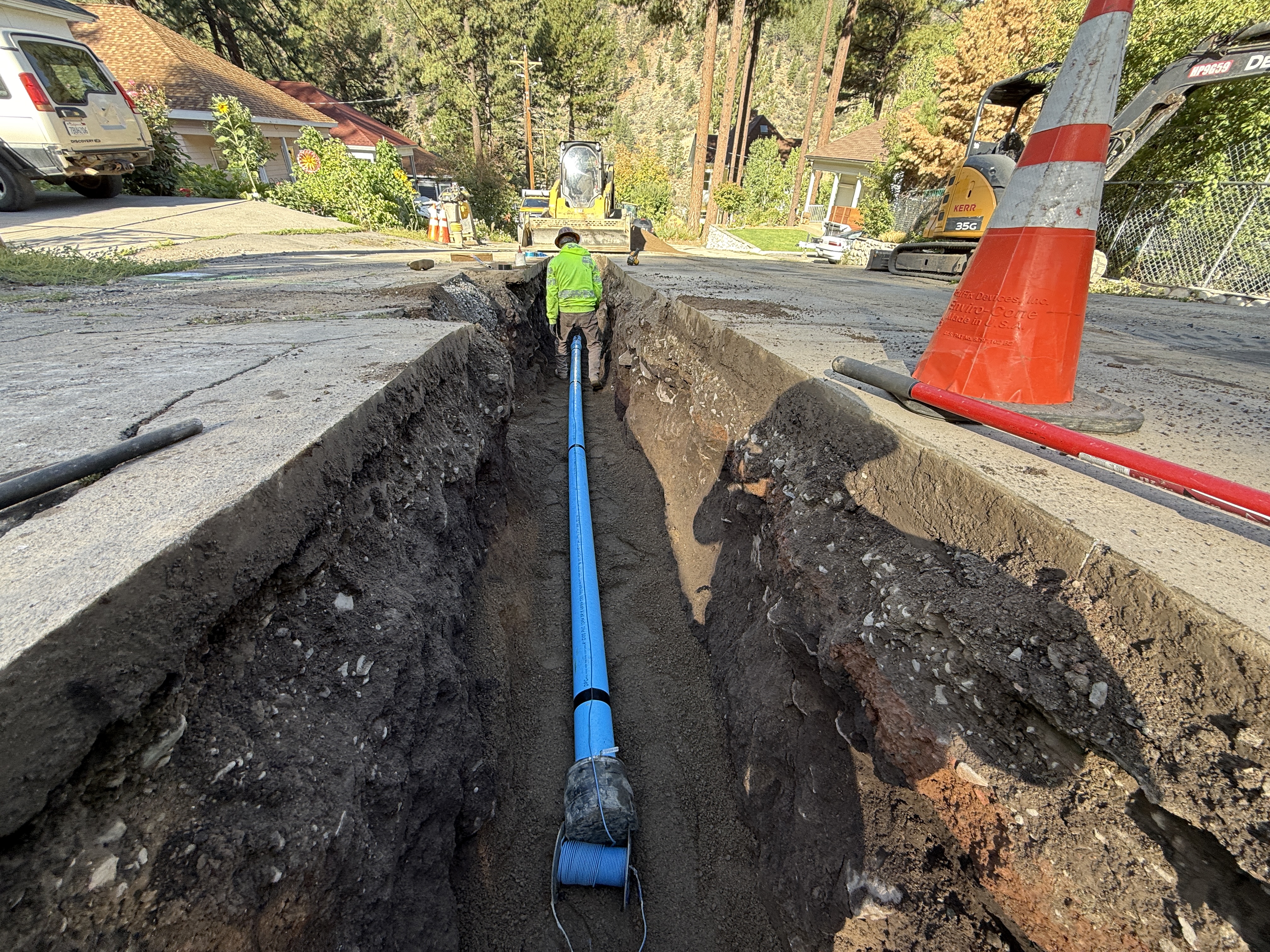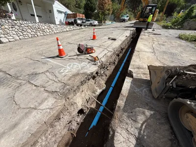 The image shows a deep trench on a street with a worker installing a blue pipe. The trench runs down the center of the road with the worker positioned at the end of the visible pipeline. An excavator is present at one end of the trench, and safety cones are positioned along the trench edges. The area appears to be a residential neighborhood with houses visible in the background.