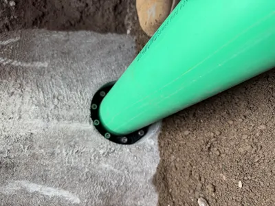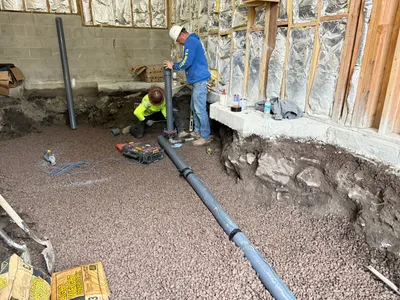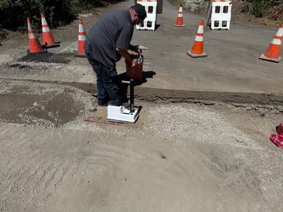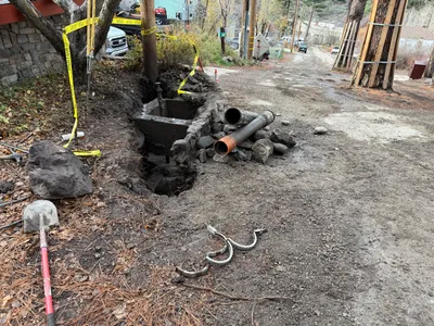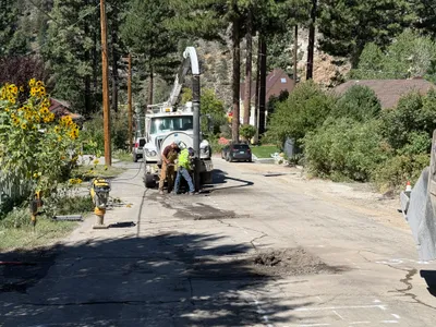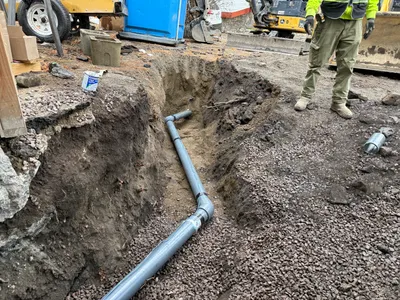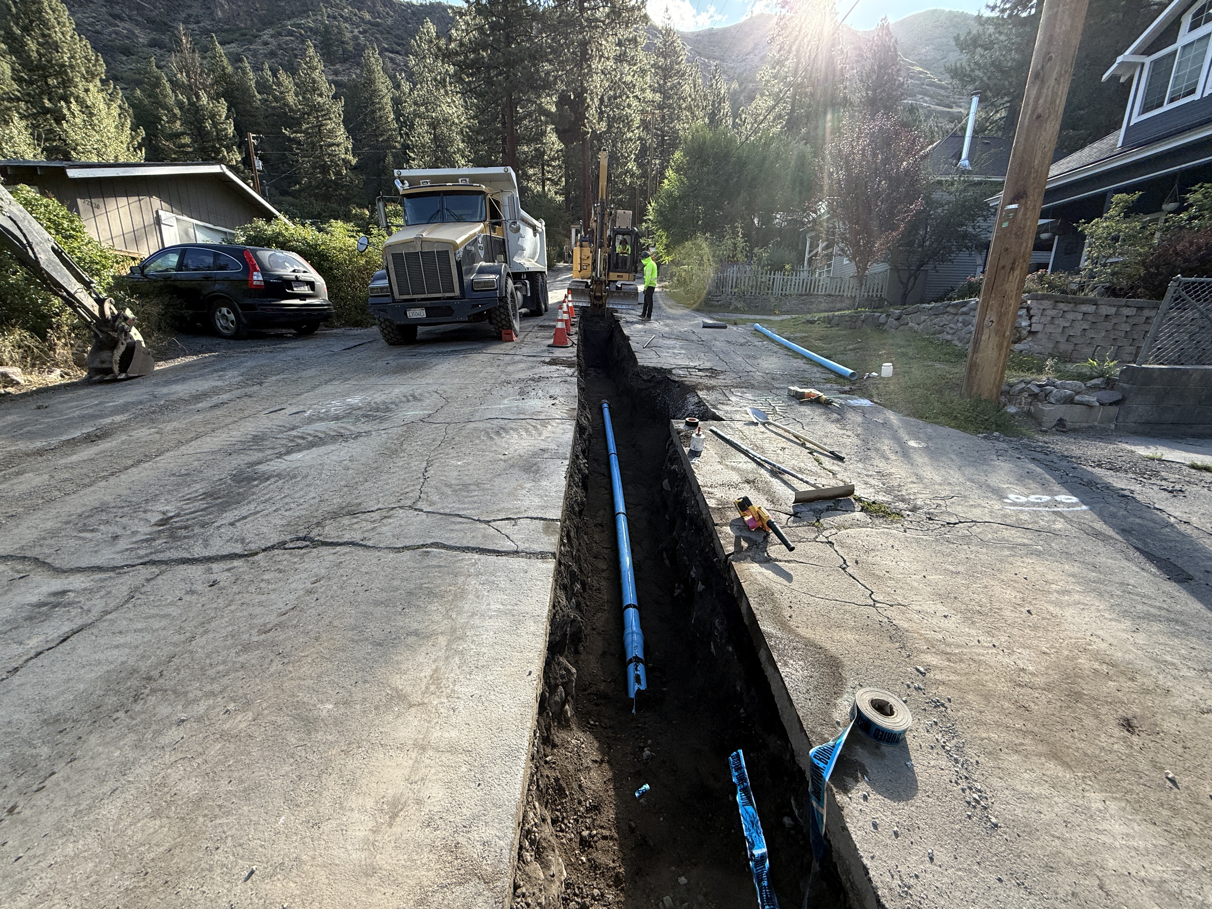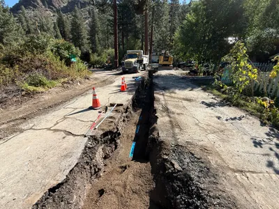 The image shows a long trench on a paved residential street with blue pipes visible inside. A large truck and a piece of heavy machinery are parked near the trench. Construction cones and tape are present, indicating an active work zone. A worker is visible standing near the trench, wearing a hi-vis vest. Trees and houses line the street in the background.