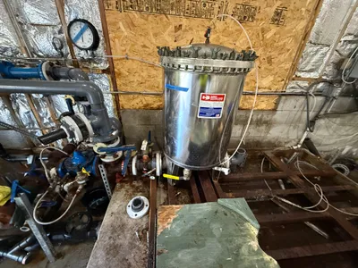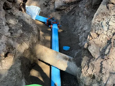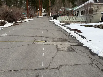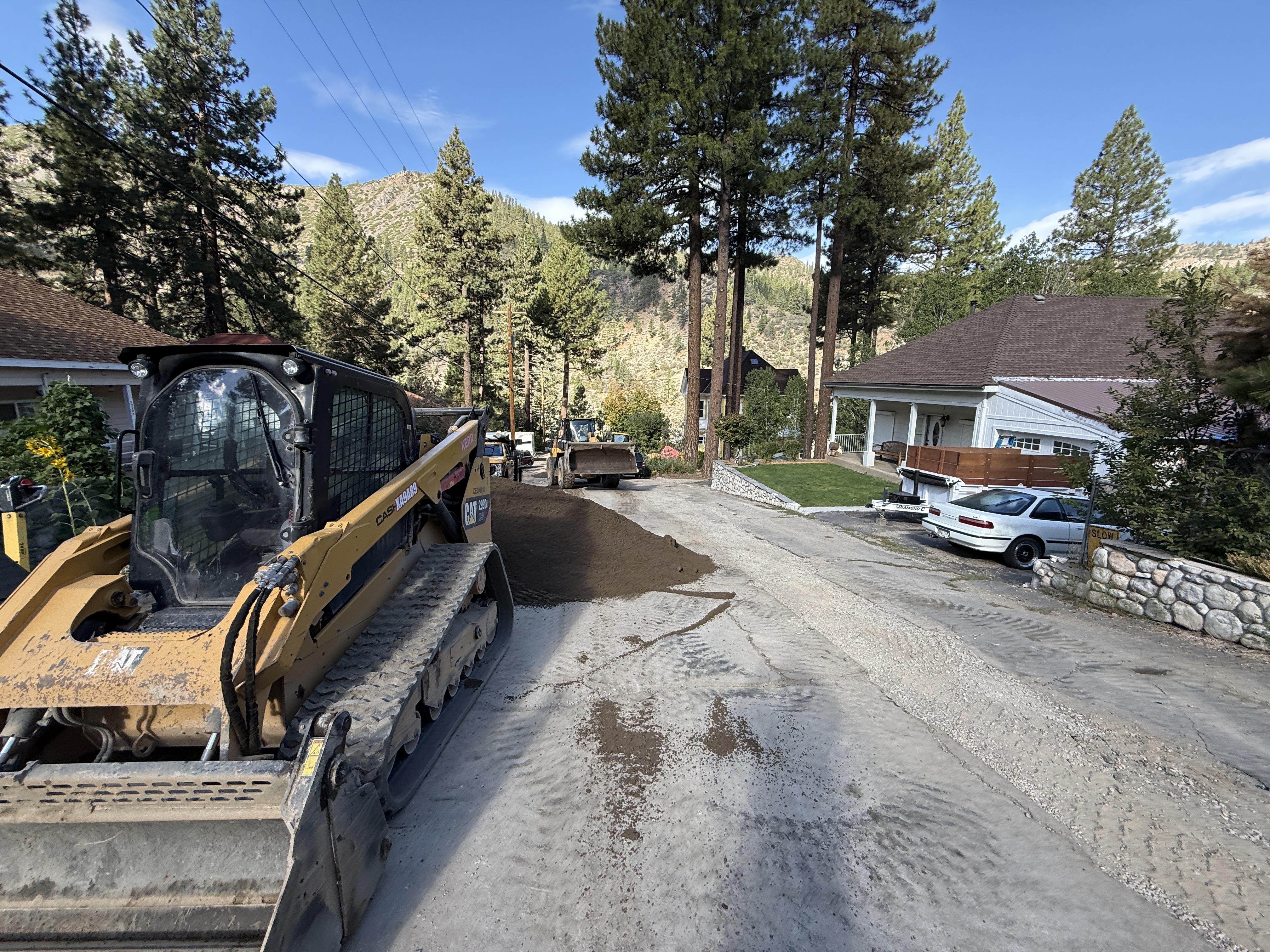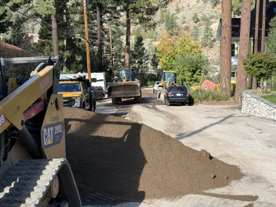 The image shows a compact track loader and bulldozer involved in site grading on a residential street. The loader is positioned on the left side of the road, pushing soil towards the right side where a small pile is forming. Houses and trees are visible in the background, indicating a residential area. The street surface appears disturbed with visible soil working, suggesting grading or preparation activities.