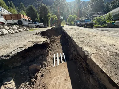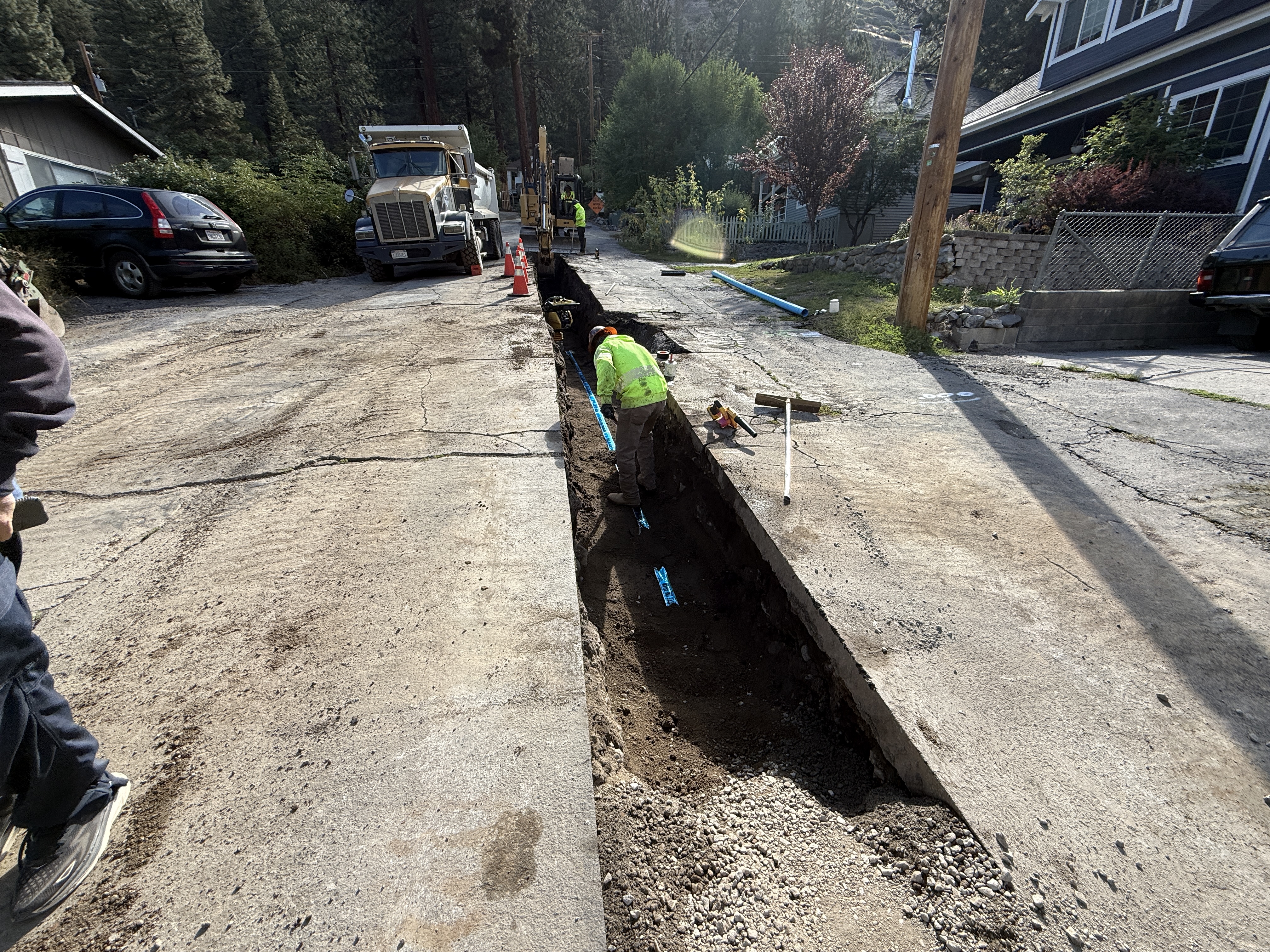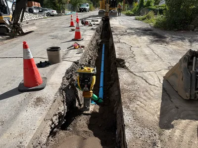The image shows a trench being excavated along a residential road with workers actively engaged in the work. A construction worker in a hi-vis vest is positioned in the trench, indicating active installation or inspection. PVC pipes are staged near the trench. A dump truck and an excavator are parked nearby, and traffic cones are placed along the trench for safety.
