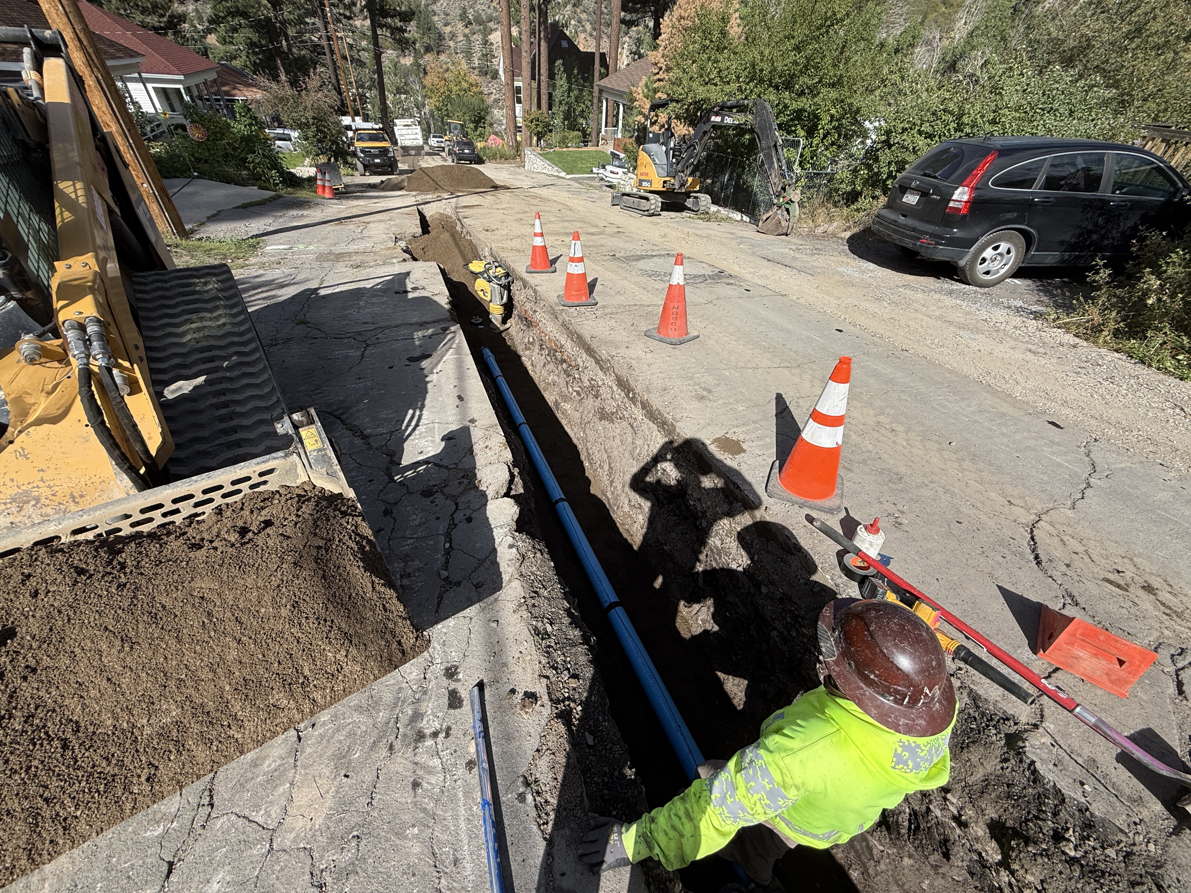 Safety features include cones around the trench and PPE on workers.
