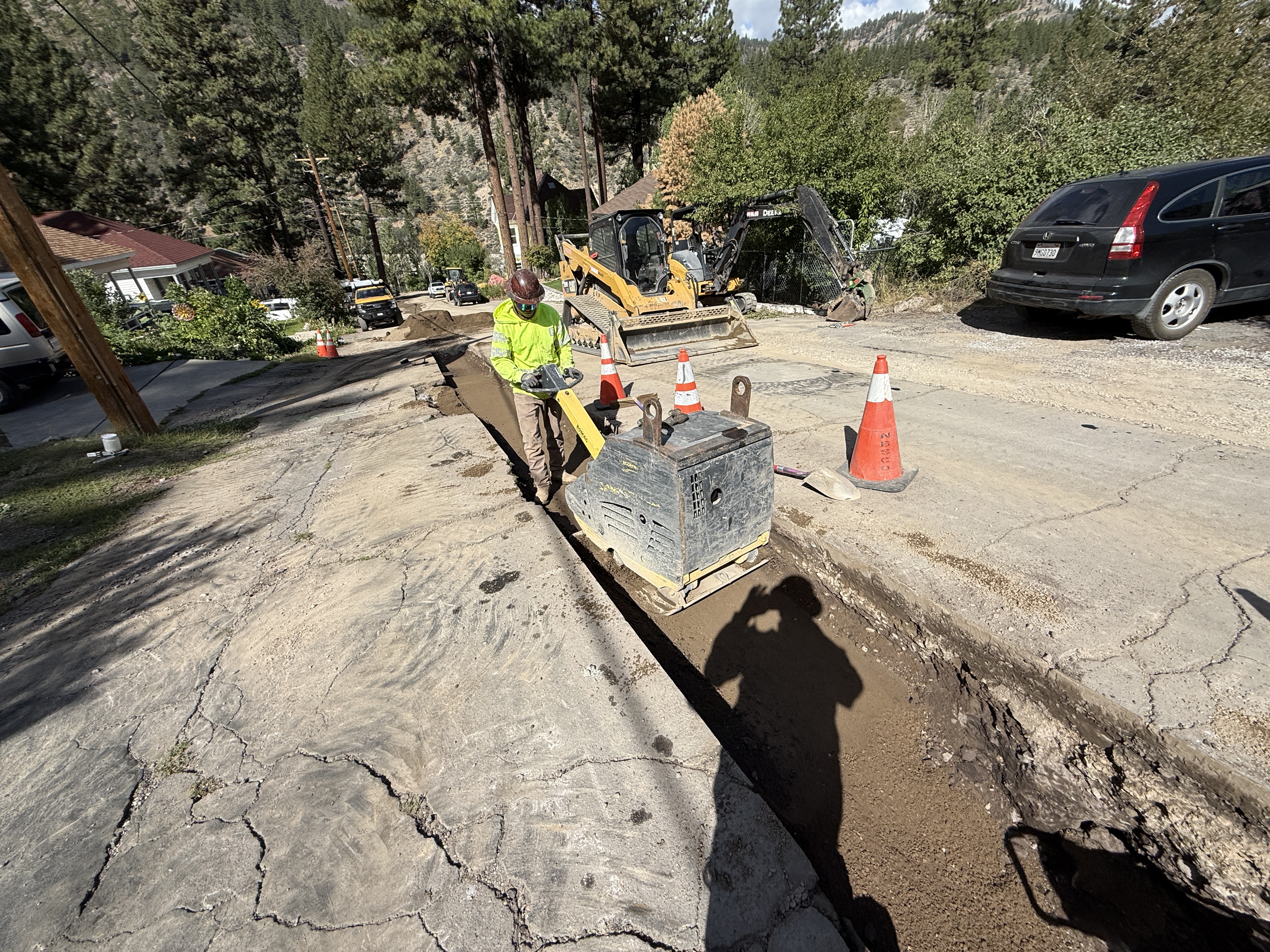 The image shows a worker conducting trenching along a residential street with an excavator parked nearby. The worker is using a tool likely for measuring or stabilization within the trench. Safety cones are placed around the trench, which is lined with a trench box. The surface is a mixture of pavement and soil, with trees and vegetation visible in the background.
