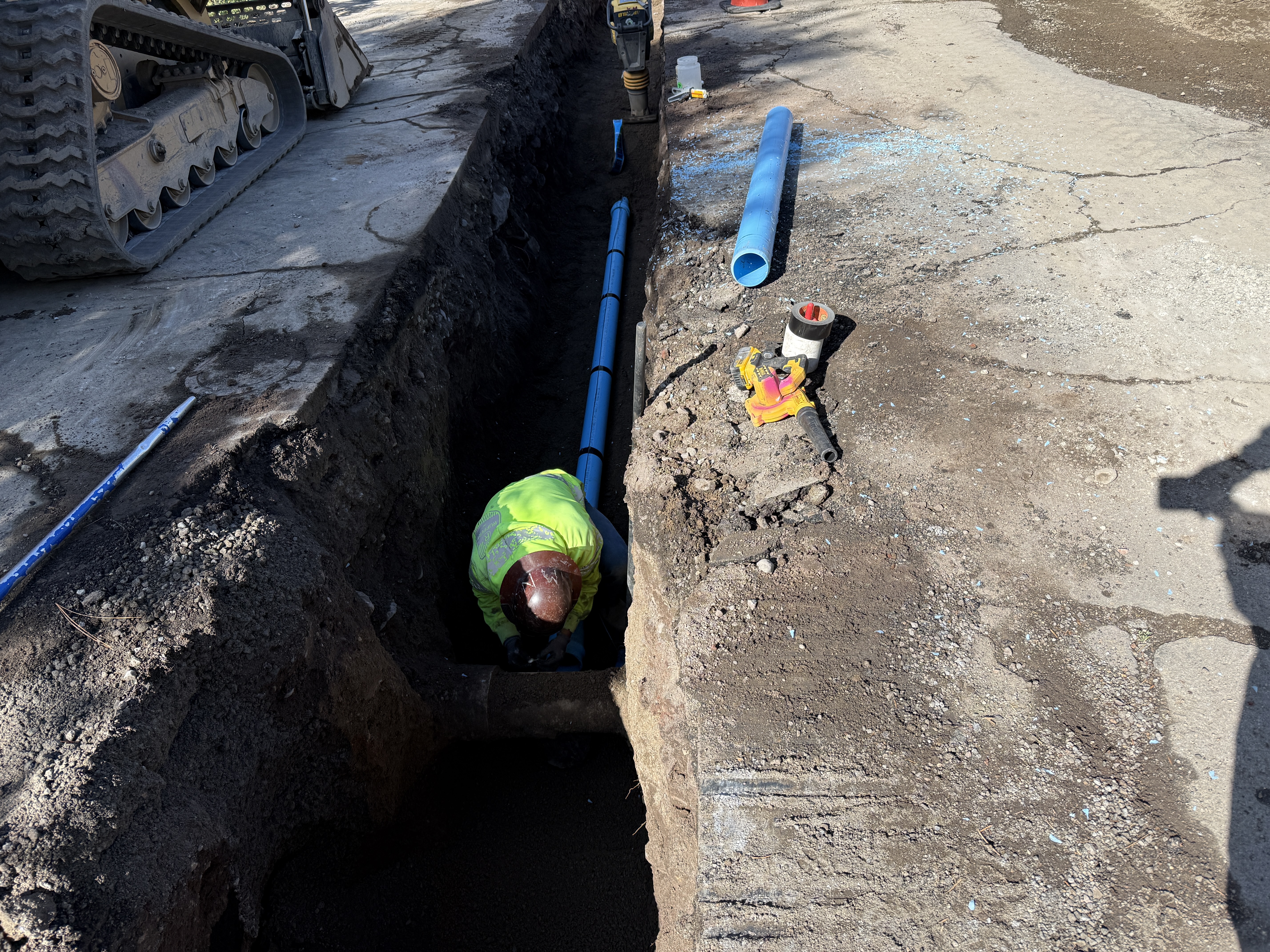 A worker is inside a trench, aligning a blue pipeline section manually. The trench extends along a paved area, and there is an excavation machine positioned nearby. The worker is wearing safety gear including a hard hat and hi-vis vest. Additional pipeline sections and a small hand tool are visible on the trench edge.