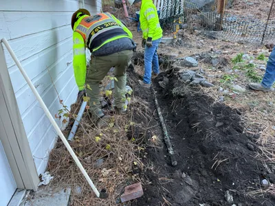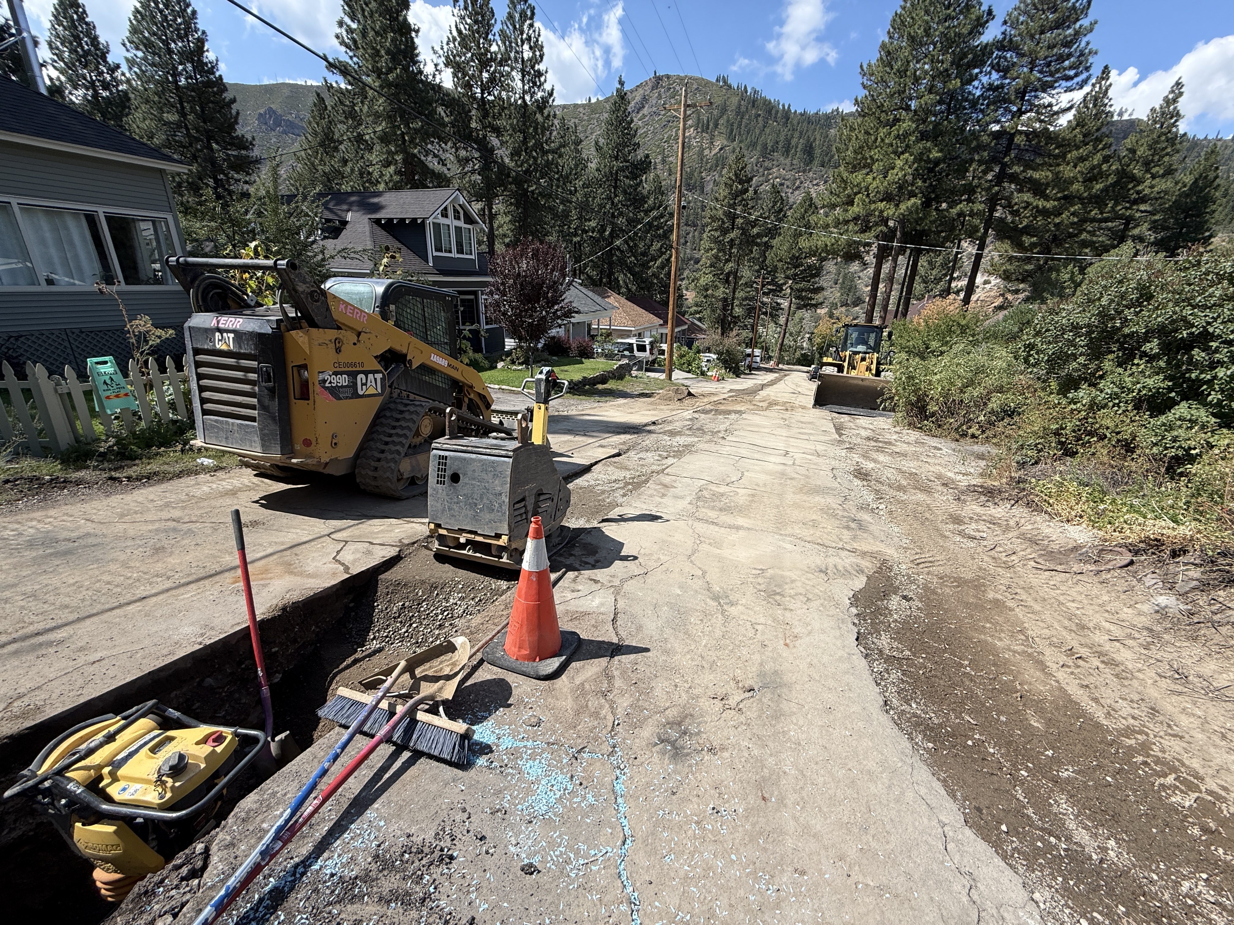 The image shows a trench being excavated along a residential street with visible construction equipment including a skid steer and a compactor. Safety cones and tools like shovels and brooms are positioned near the trench. The street has pine trees lining one side, and some houses are visible along with utility poles. Blue marking material indicates possible utility lines.
