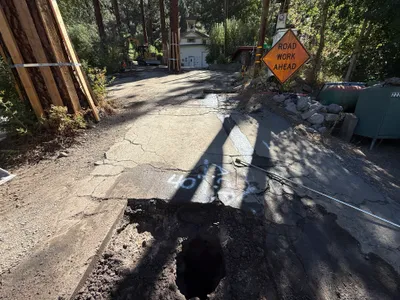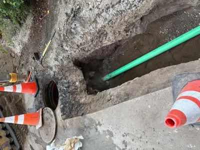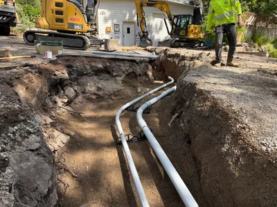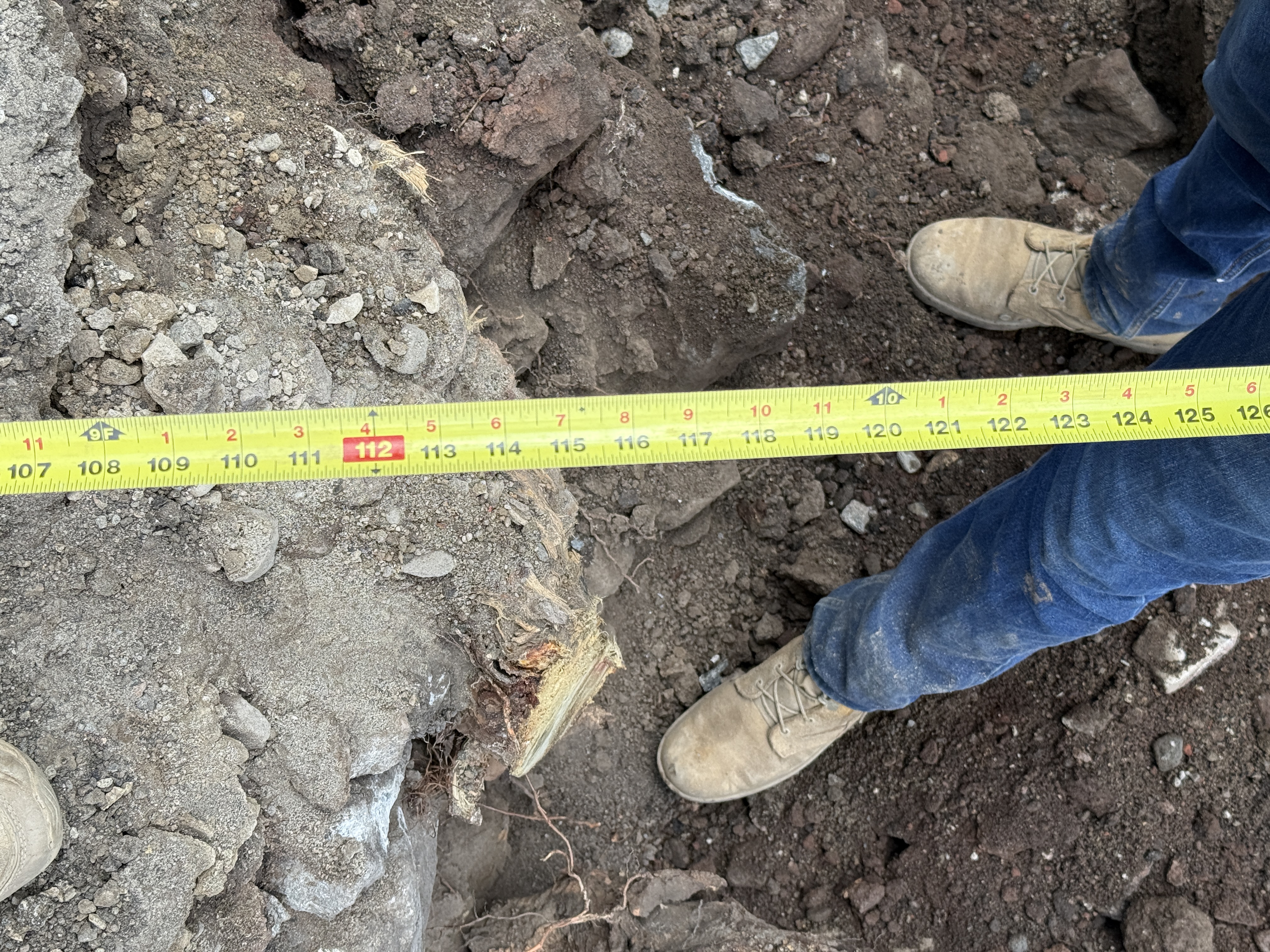 The image shows a measuring tape extended across a dirt and rock surface at a construction site. A person wearing jeans and work boots is holding the tape. The tape reading is around 112 inches. There are no signs of additional construction activities occurring in the image.