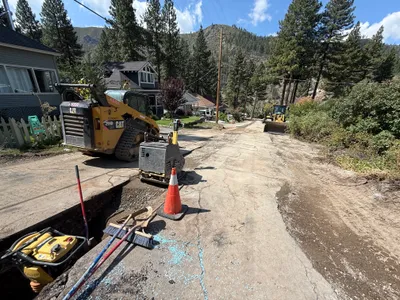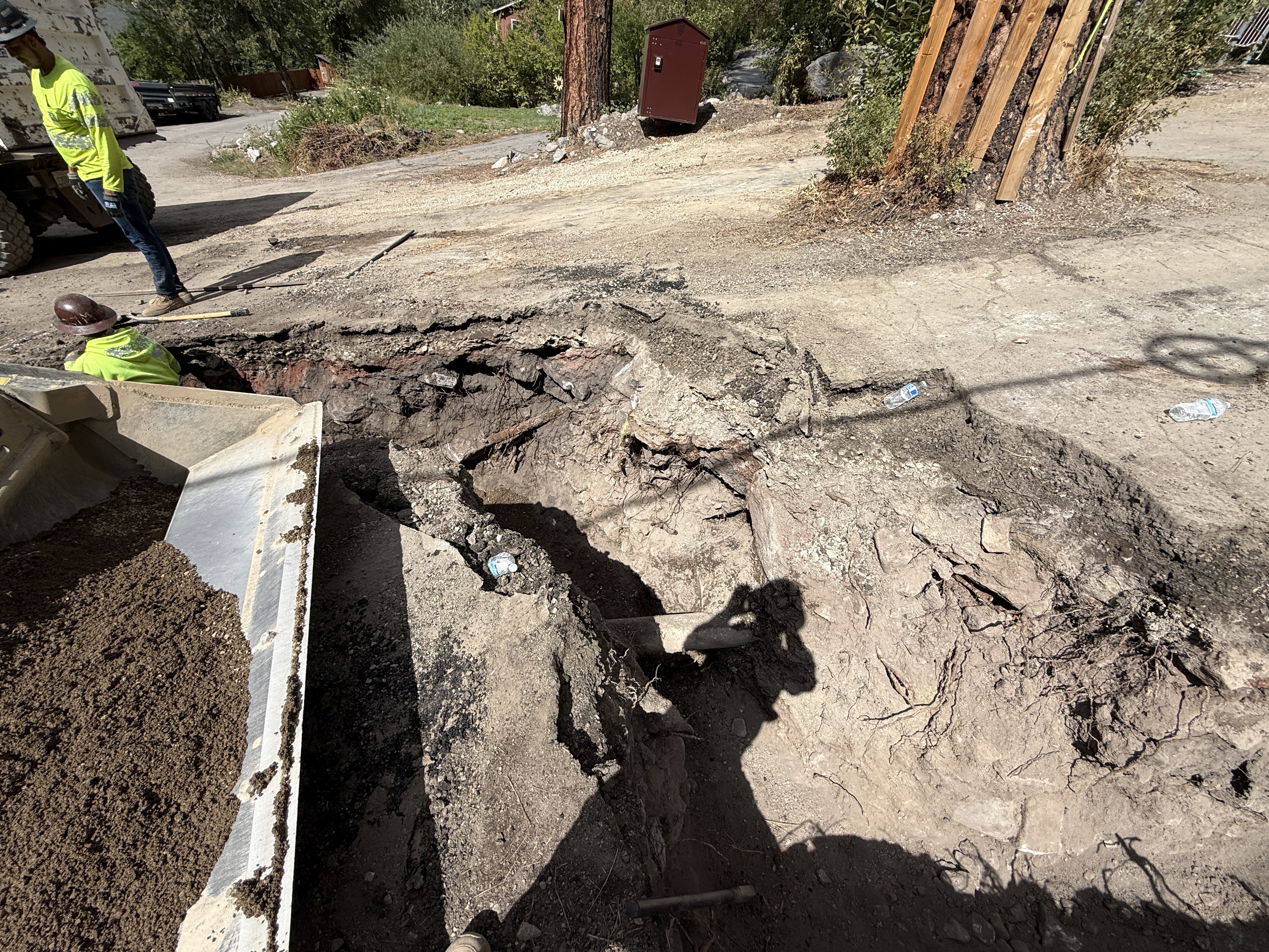 cracked and damaged road surface with open trench sunny daylight conditions visible soil pile in dump truck bed