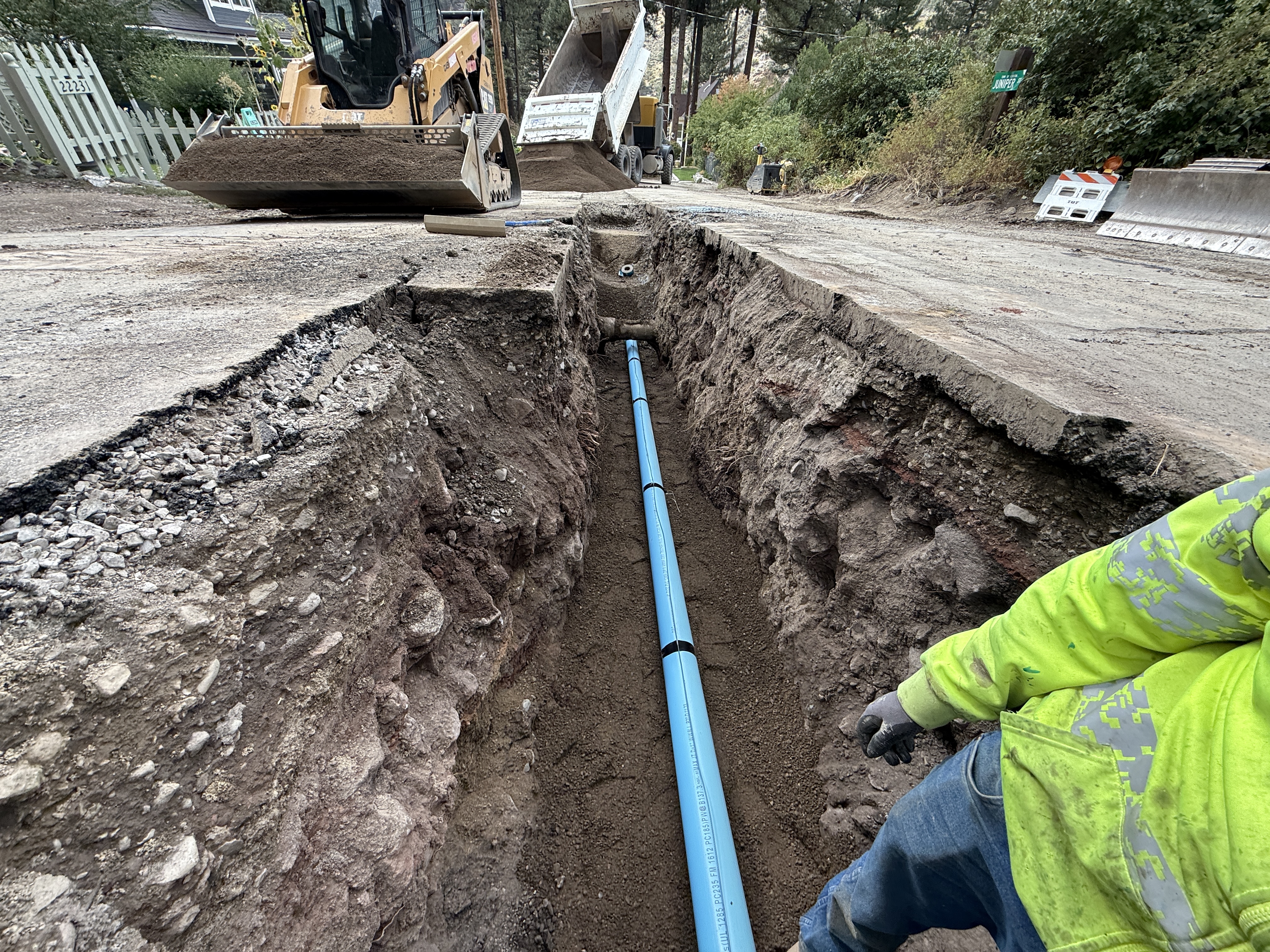 An open trench is visible running along the road with blue pipe sections installed within it. A worker in high-visibility clothing is present at the edge of the trench. Heavy machinery, including a backhoe and a dump truck, are near the trench, presumably for excavation and backfilling. The area is surrounded by vegetation, and the trench appears to be awaiting backfilling.