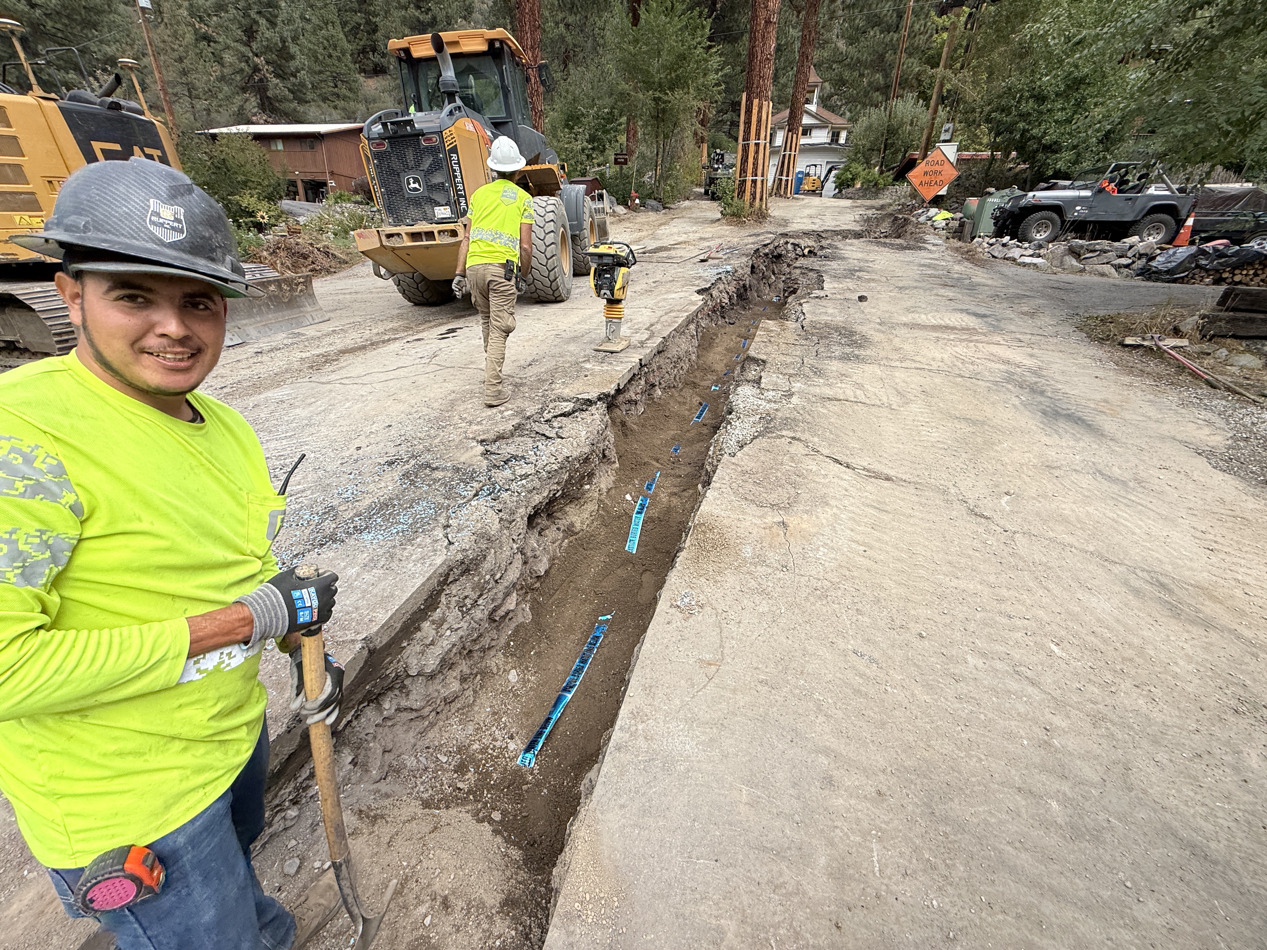 PPE is visible with open trench posing a risk, no further safety controls are visible.