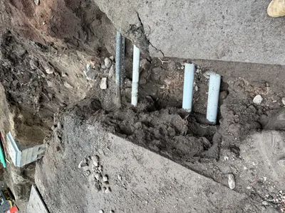 Visible PPE includes hard hats and hi-vis vests; open trench and uneven ground pose potential hazards.