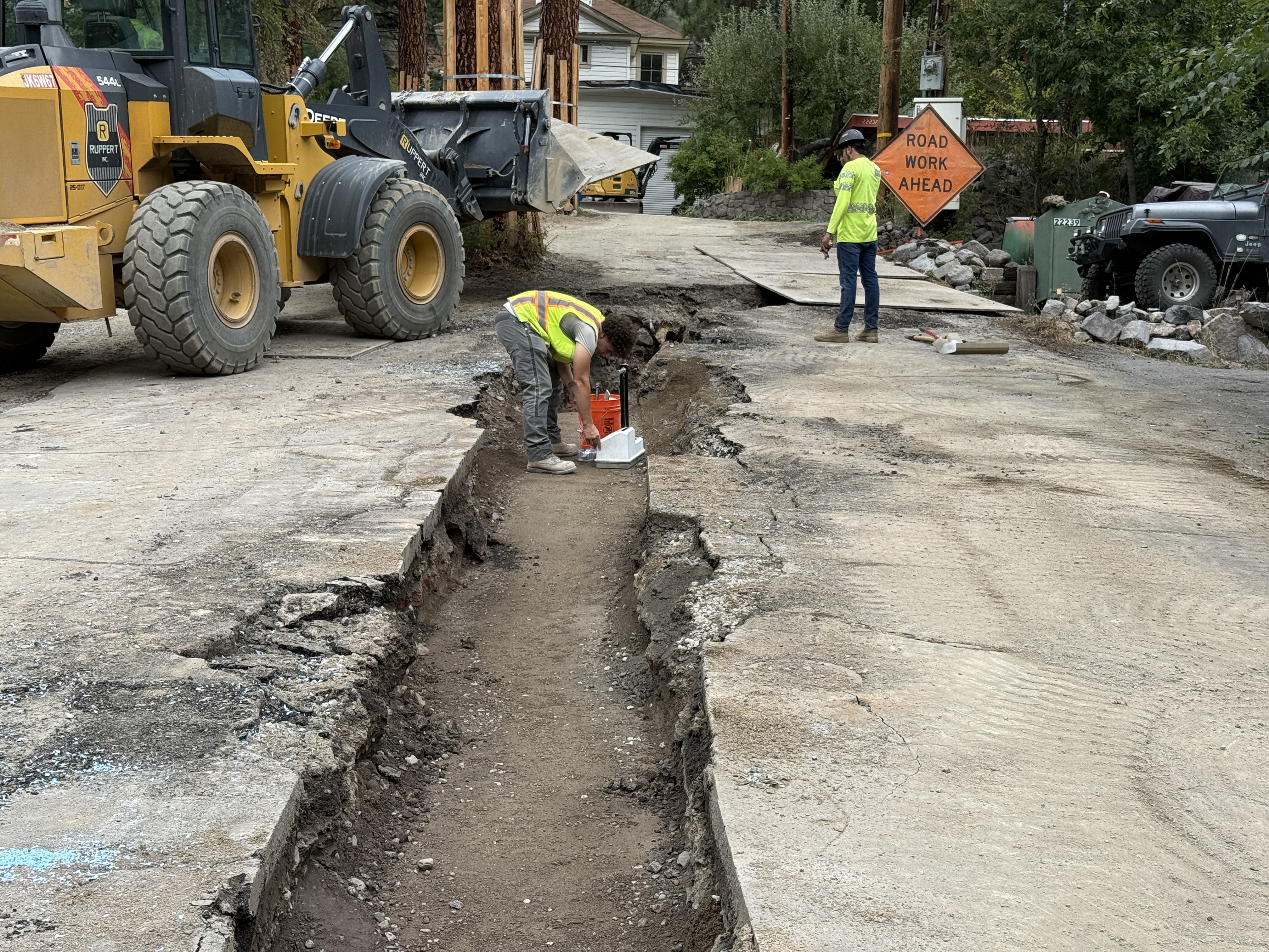 A trench is being excavated on a paved road with visible cracks and breaks. A worker is handling materials next to the trench while another stands nearby. A loader is positioned on the left side of the image. 'Road Work Ahead' signage is present, indicating ongoing construction activities.