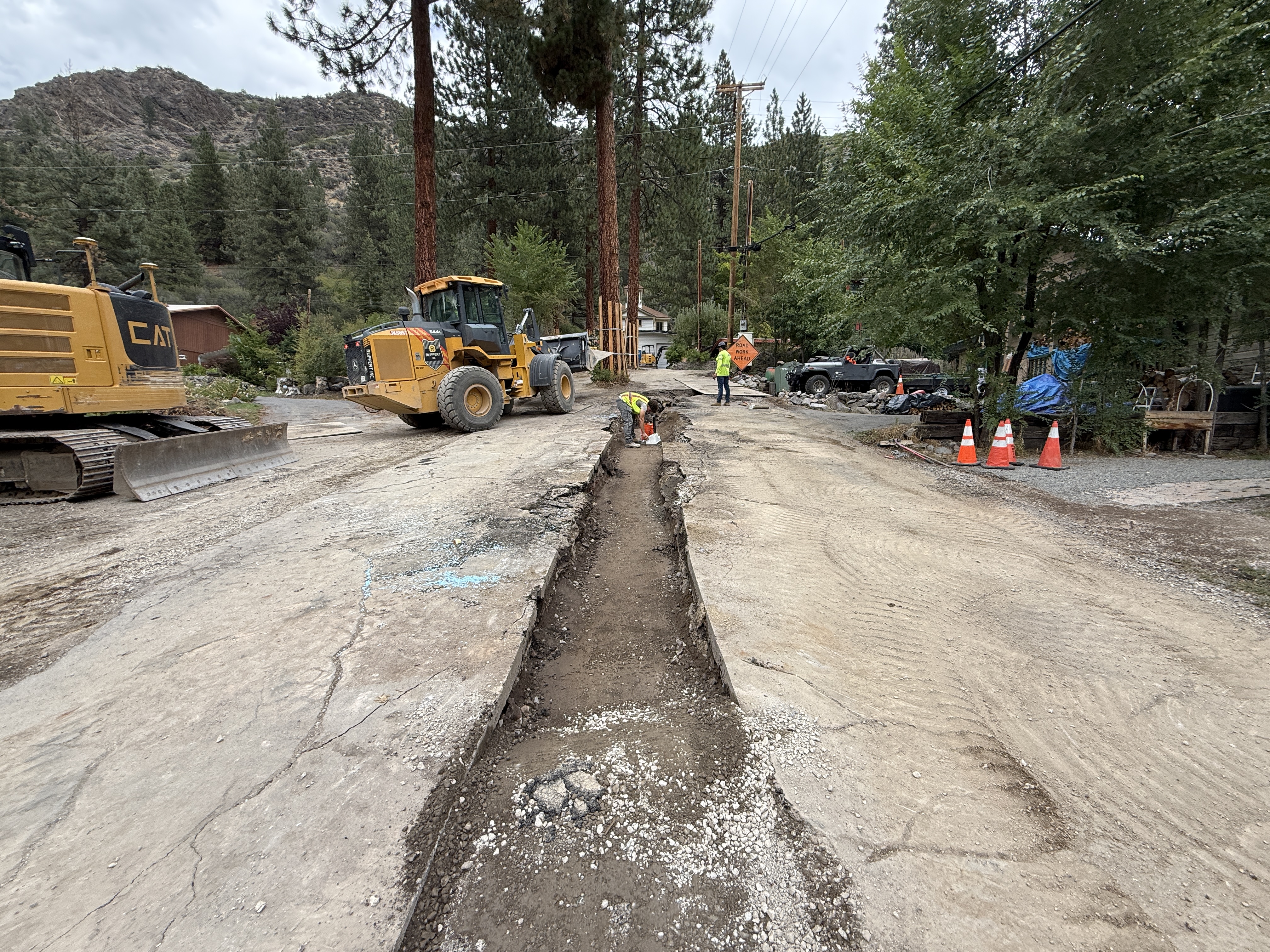 dirt road with a trench dug into it overcast conditions moderate congestion with equipment and cones