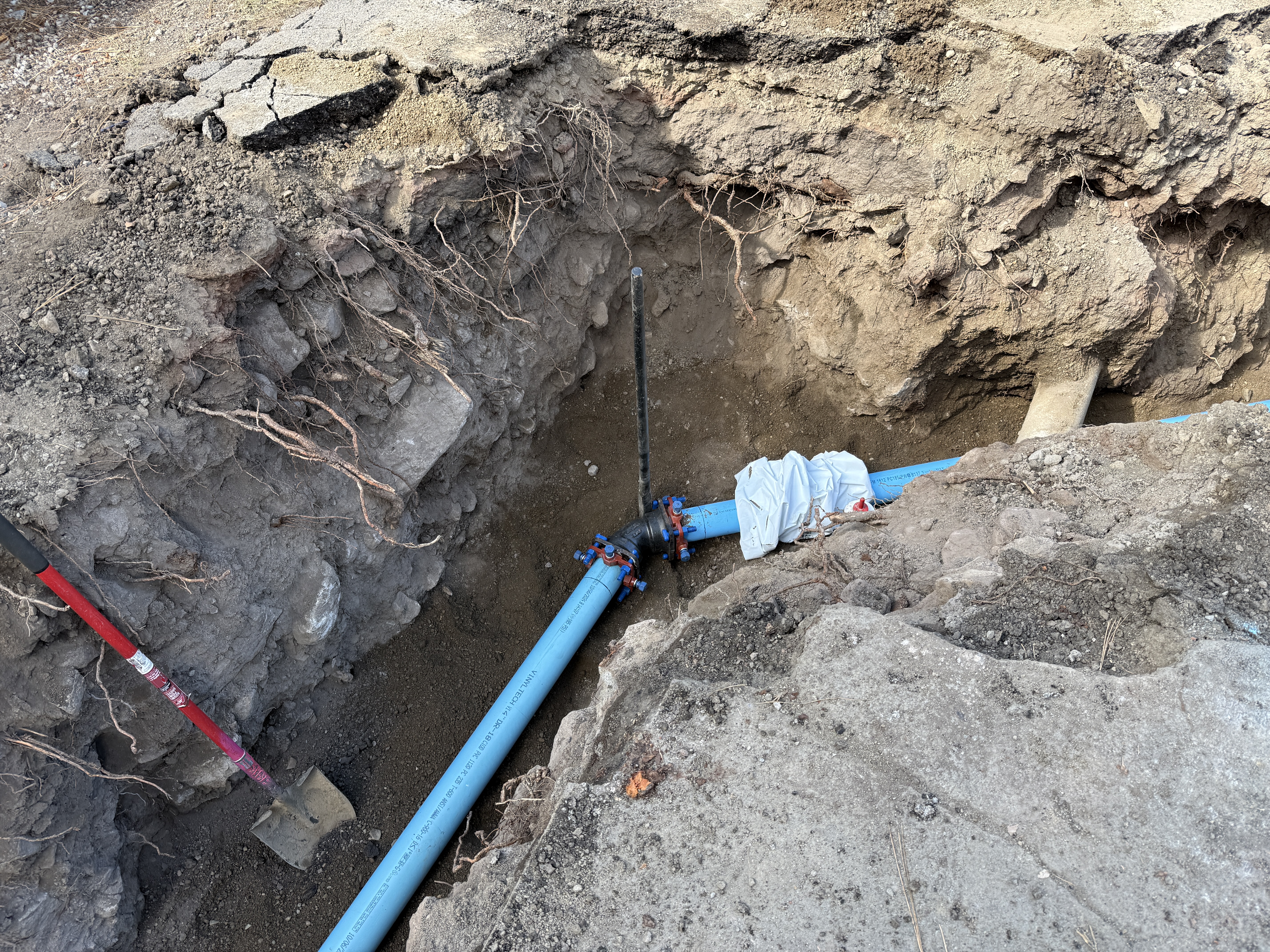 The image shows a trench with blue pipes being installed. A red-handled shovel is visible in the trench. The pipes are connected using a black fitting with additional blue fittings. The surrounding soil suggests other excavation work. The trench appears to have exposed roots along the sides.