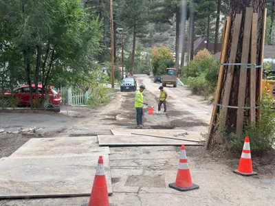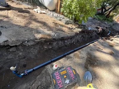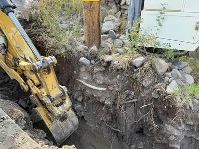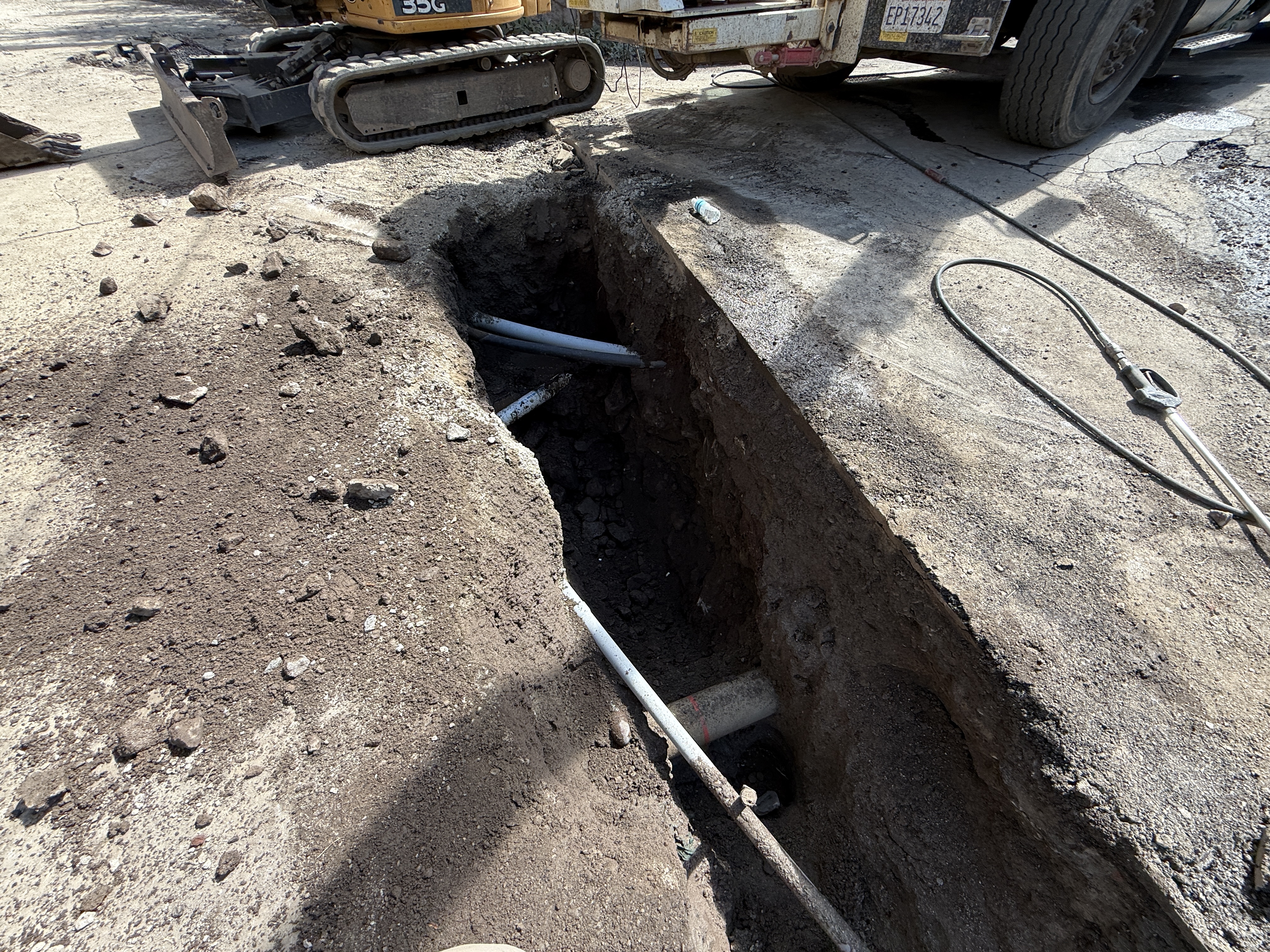 The image shows a freshly excavated trench in a construction area with visible soil spoil piles around it. An excavator is positioned next to the trench on the left side, and a truck is parked on the right. Several exposed pipes run through the trench. The area lacks visible safety barriers or personal protective equipment.