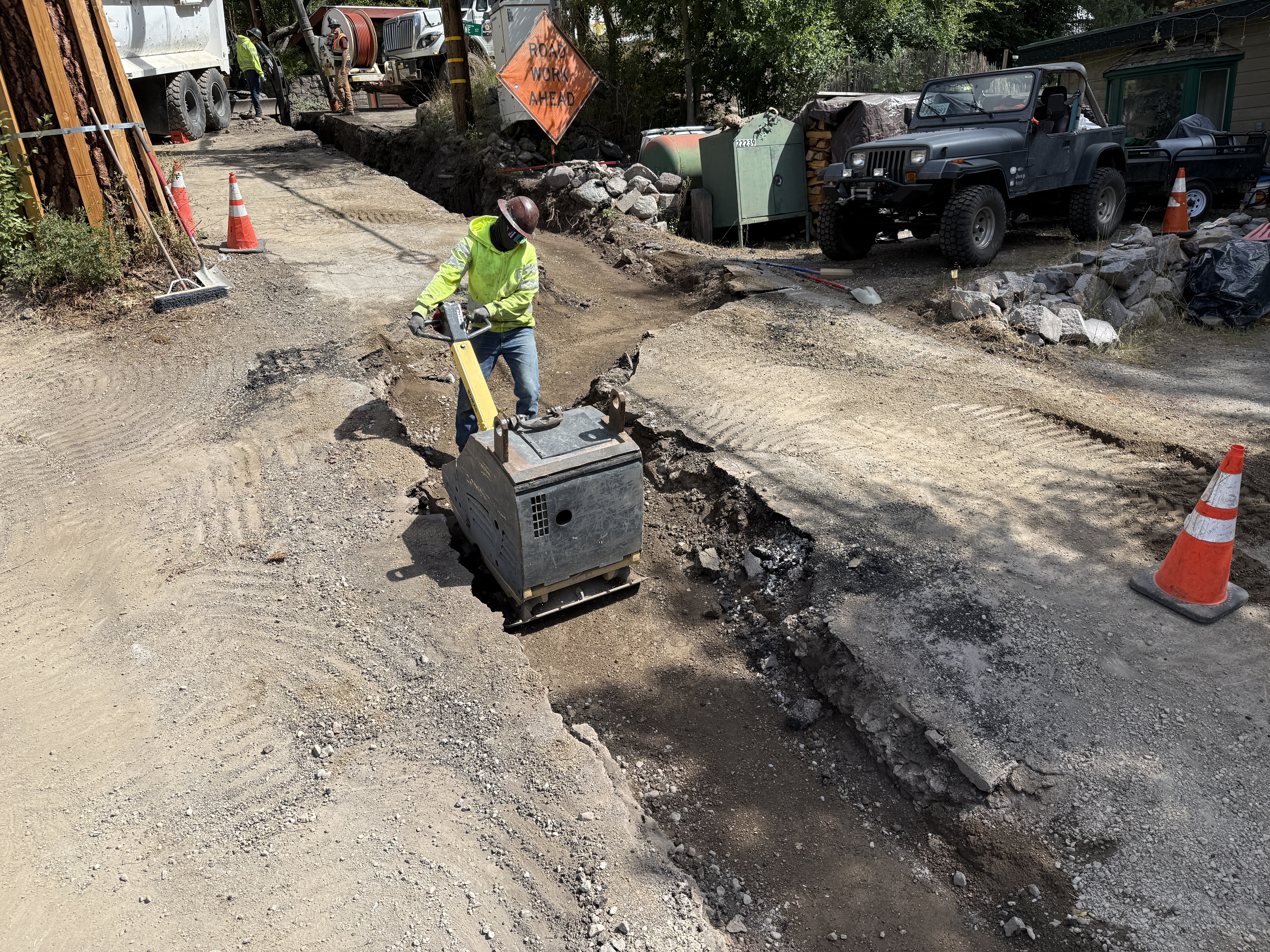 The image shows a worker using a plate compactor on a dirt road, with orange cones marking the area. There is an open trench in the background with a 'Road Work Ahead' sign. A construction vehicle and a Jeep are parked nearby.