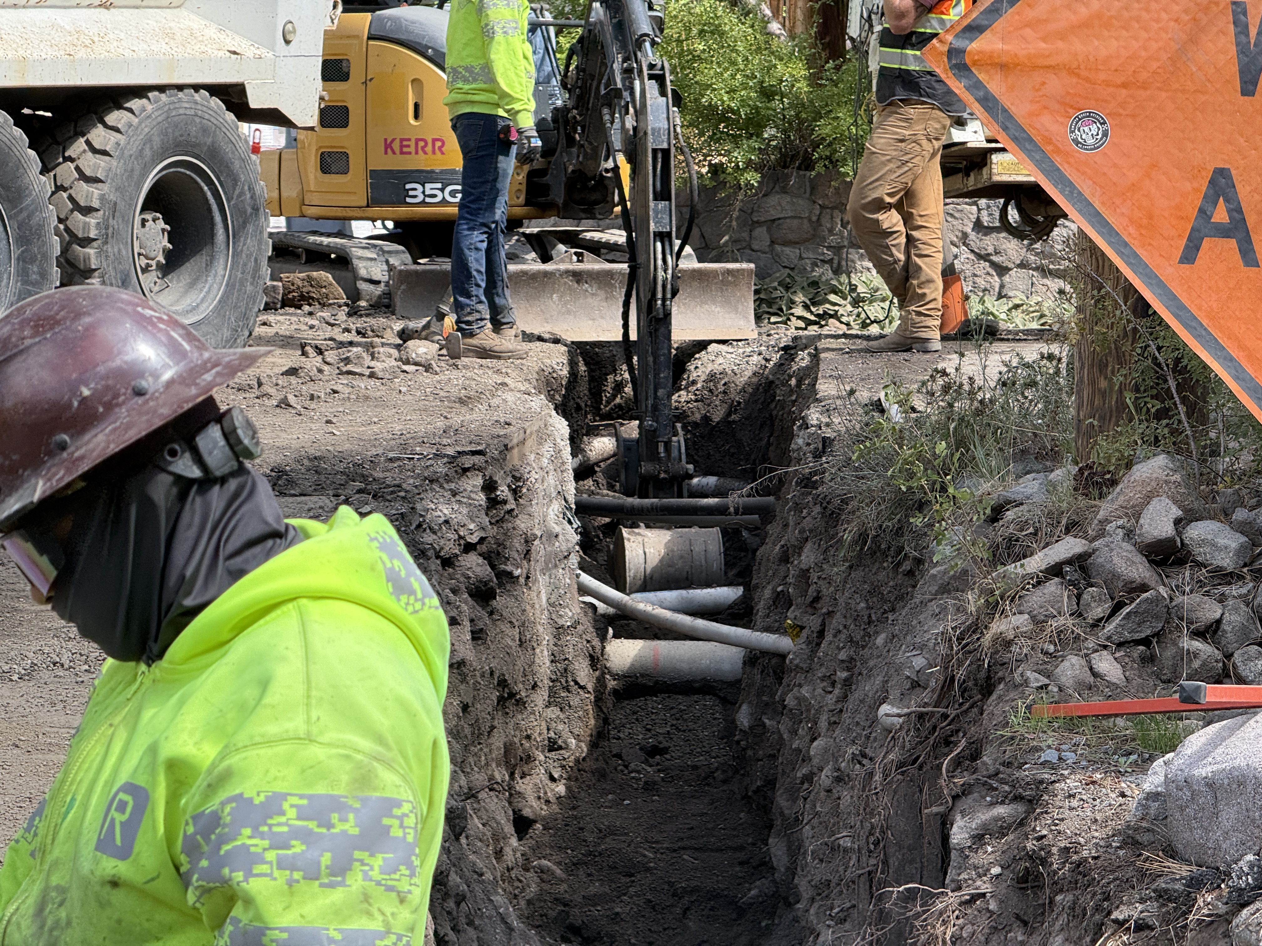 PPE including hard hats and hi-vis vests are visible, along with a caution sign for safety.