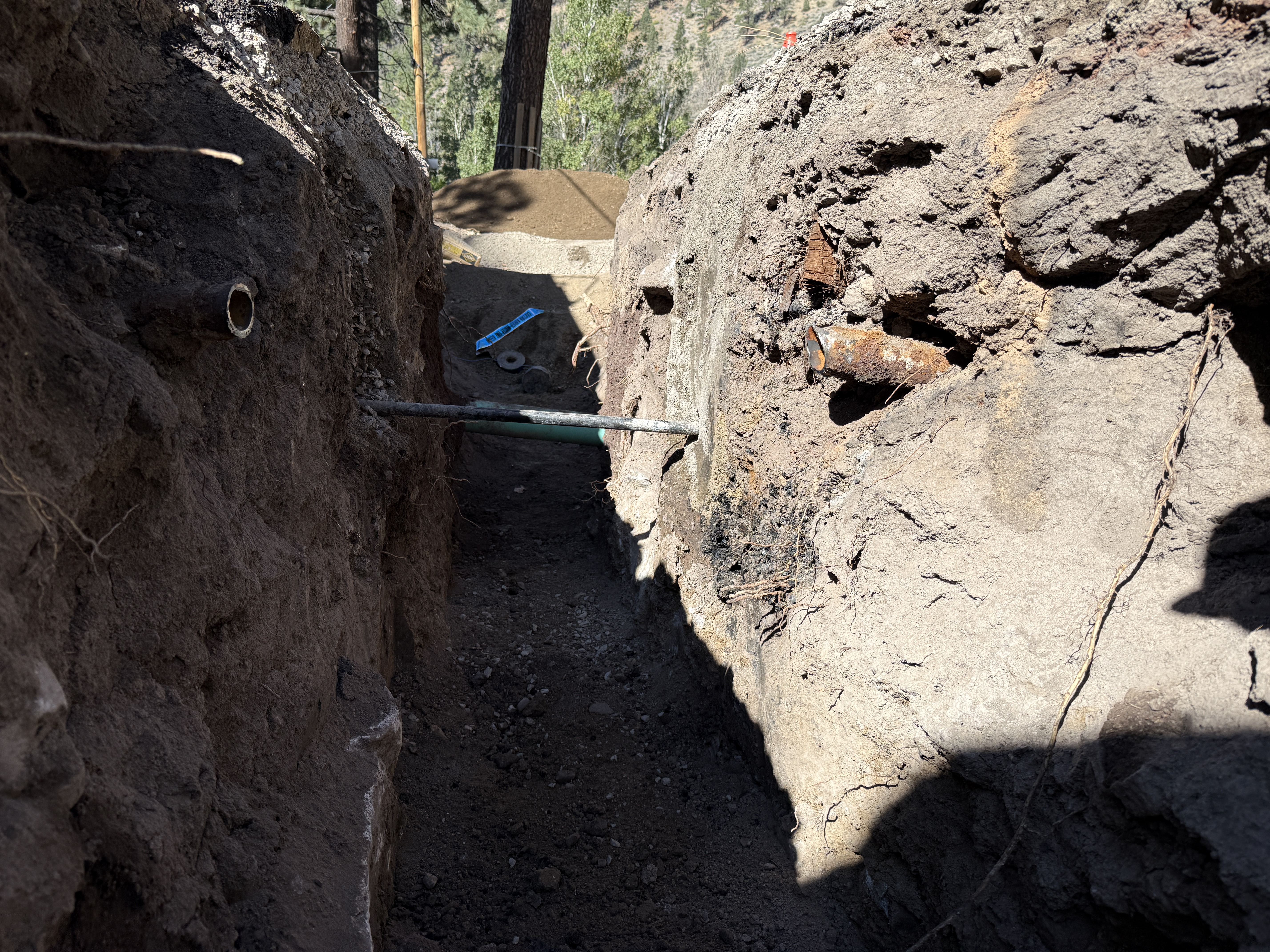 A trench is shown with exposed sections of pipes within the soil. One pipe appears rusted and another looks to be of a different material. The trench has rocky sides and runs through a wooded area. There is a visible level tool resting in the trench, possibly for alignment purposes.