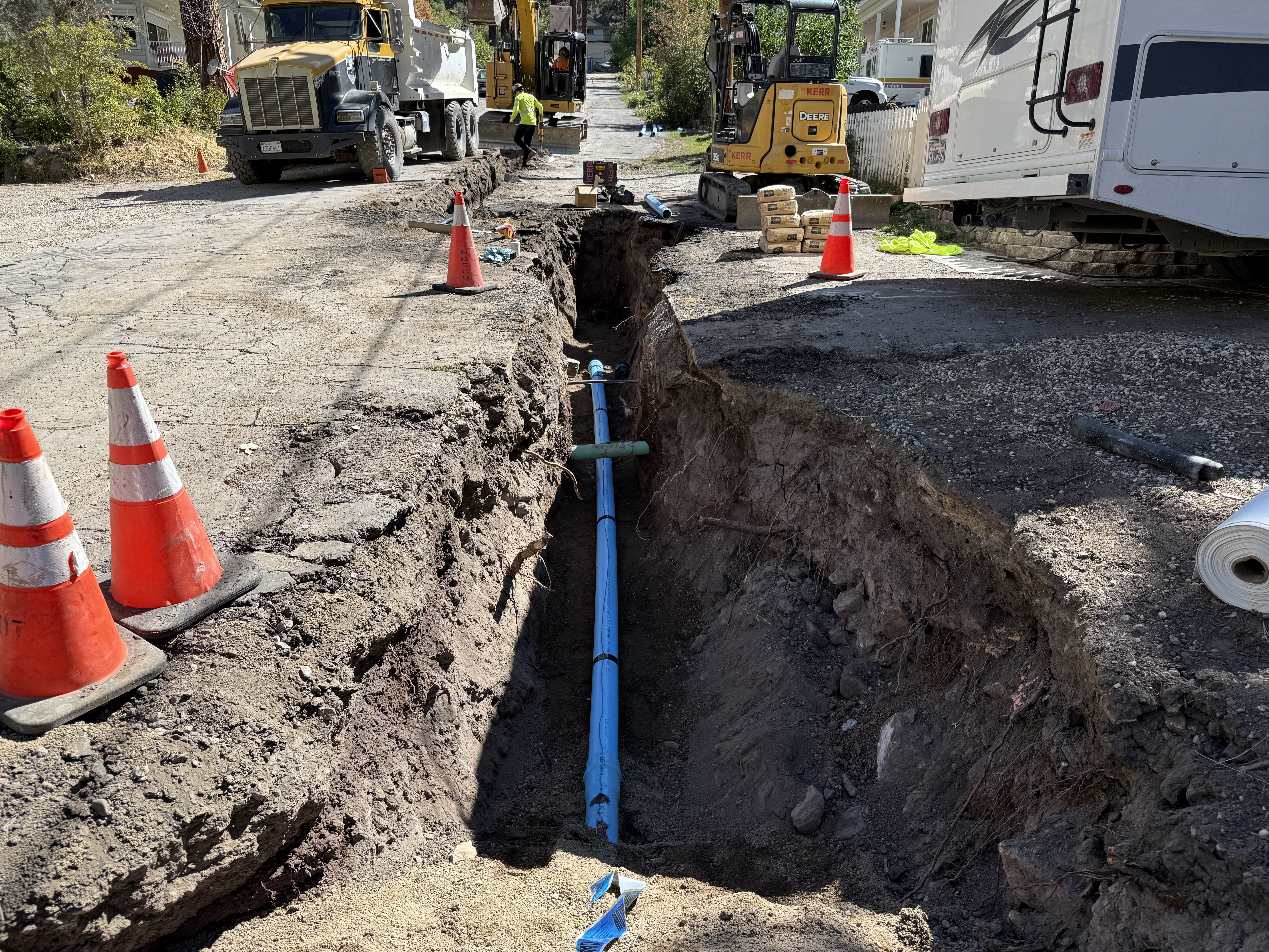 An open trench runs parallel to a road, with blue piping installed within it. Construction cones are placed around the trench for safety. Heavy equipment like an excavator and a dump truck are visible. A worker in a hi-vis vest is present near the machinery.