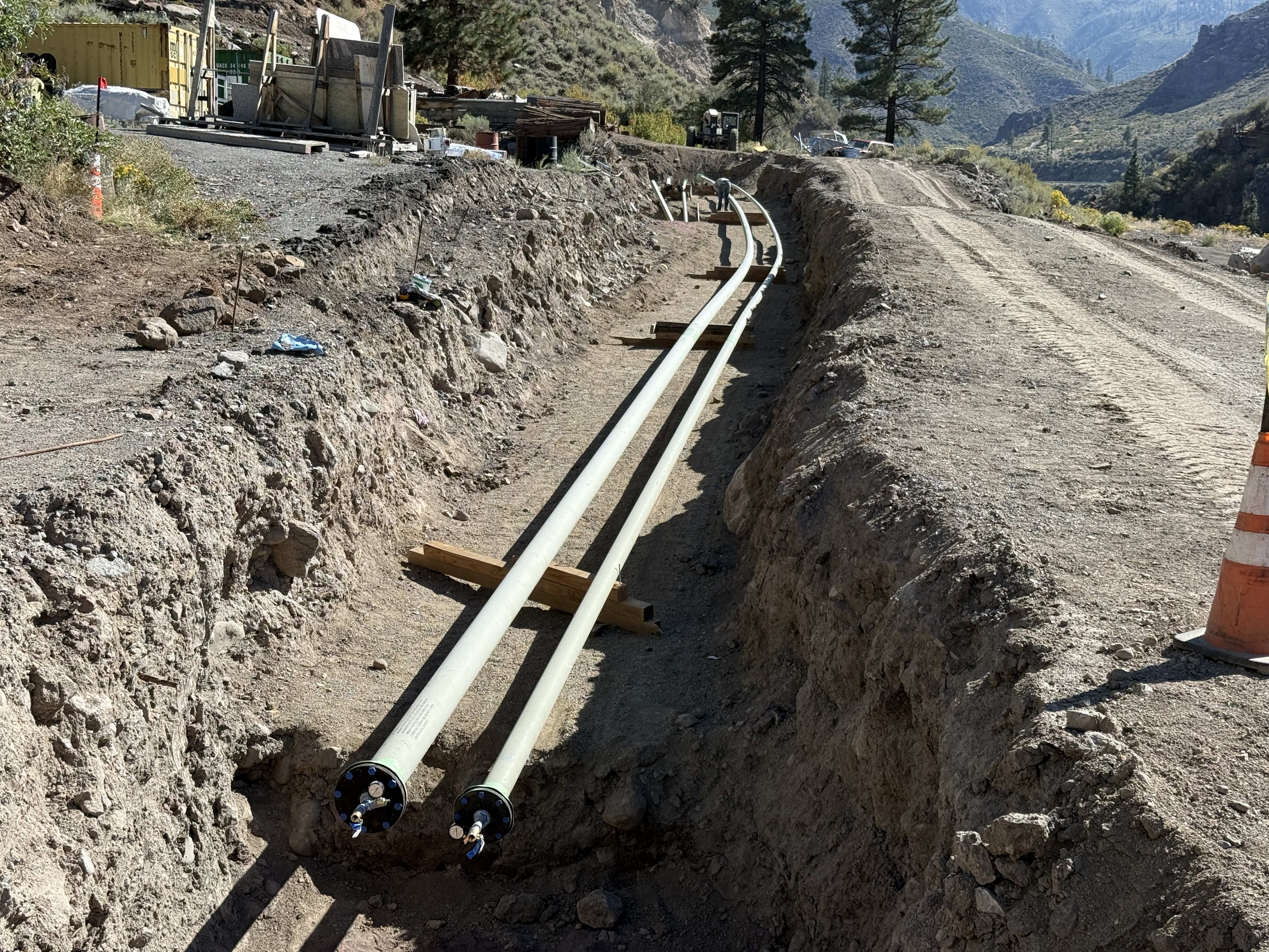 The image shows an open trench with two parallel pipes laid at the bottom. The pipes are supported by wooden blocks and are not yet buried. Construction materials and equipment are visible in the background, indicating active site work. The area appears to be in a rural location, surrounded by dirt paths and vegetation.