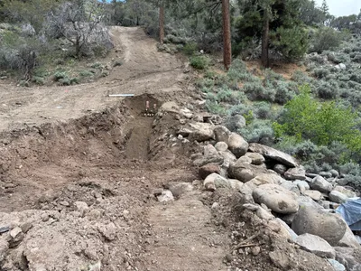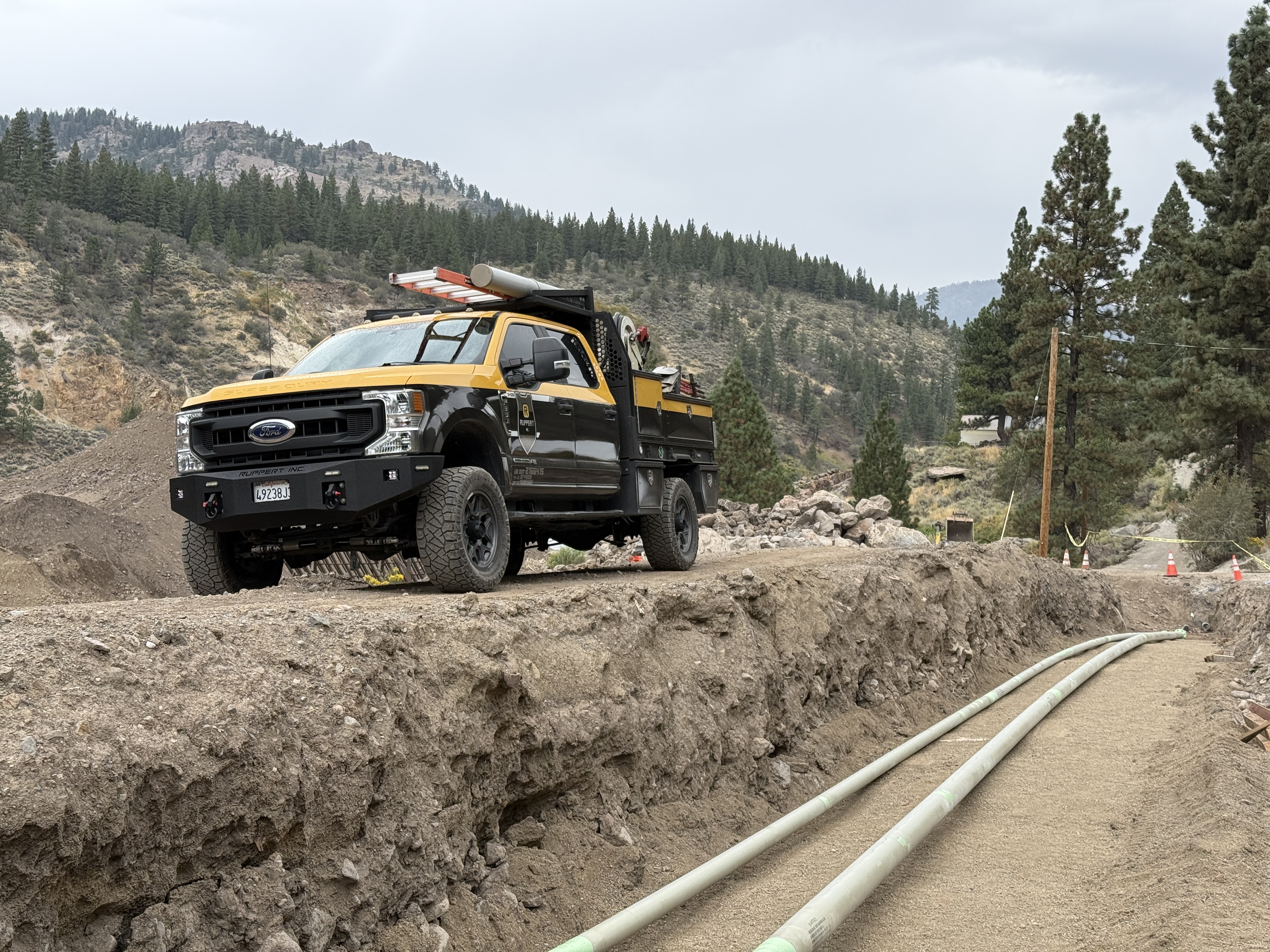 The image shows an open trench with visible pipes laid along its base. A utility truck is parked adjacent to the trench with various equipment mounted on it. The site is in a rural setting with trees and hills in the background. Some traffic cones are placed at the perimeter of the work area, indicating an active work zone.
