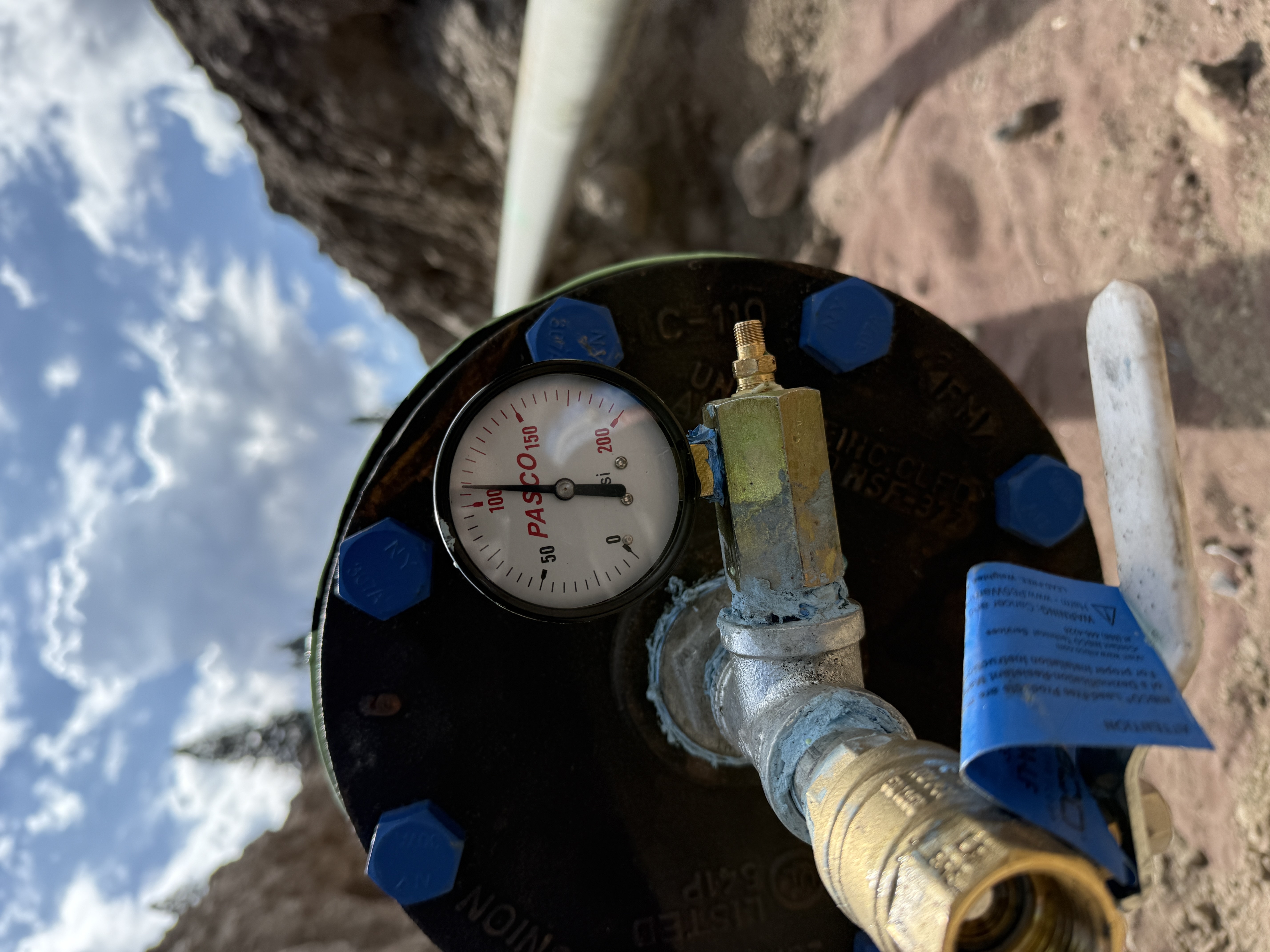 The image captures a pressure gauge labeled 'PASCO' mounted on a pipe with various fittings and connectors. The gauge displays a reading, and the setup is part of a metallic pipeline section. The environment appears outdoor with rocky terrain and a partly cloudy sky visible. The pipe runs along a trench or open area indicating pipeline work.
