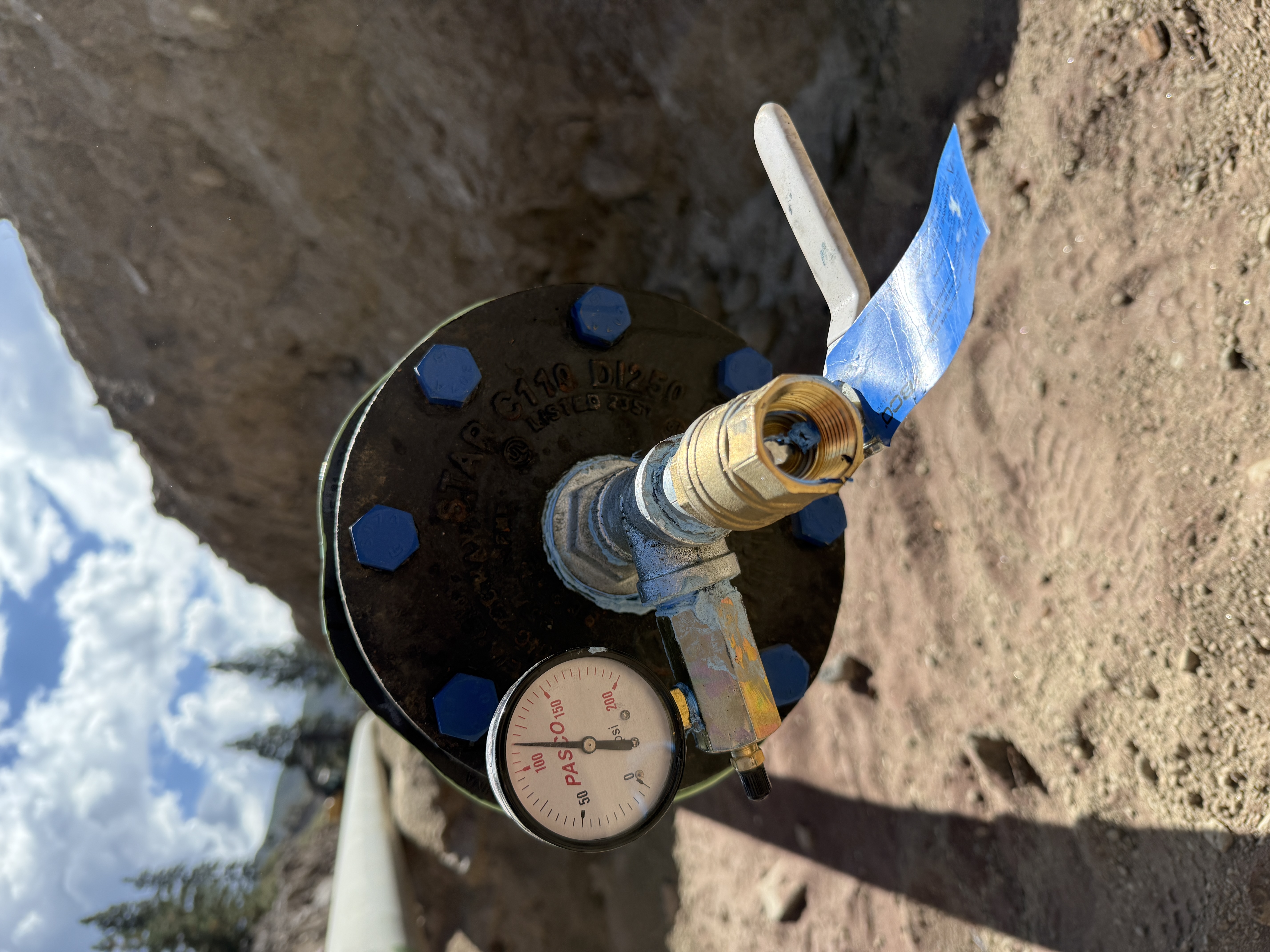 The image displays a pressure gauge reading around 100 psi attached to a welded steel pipe section. A ball valve with a blue handle and fittings are also visible. The pipe appears to be flanged and is located in a trench. The setting suggests preparation for pipeline service or testing activities.