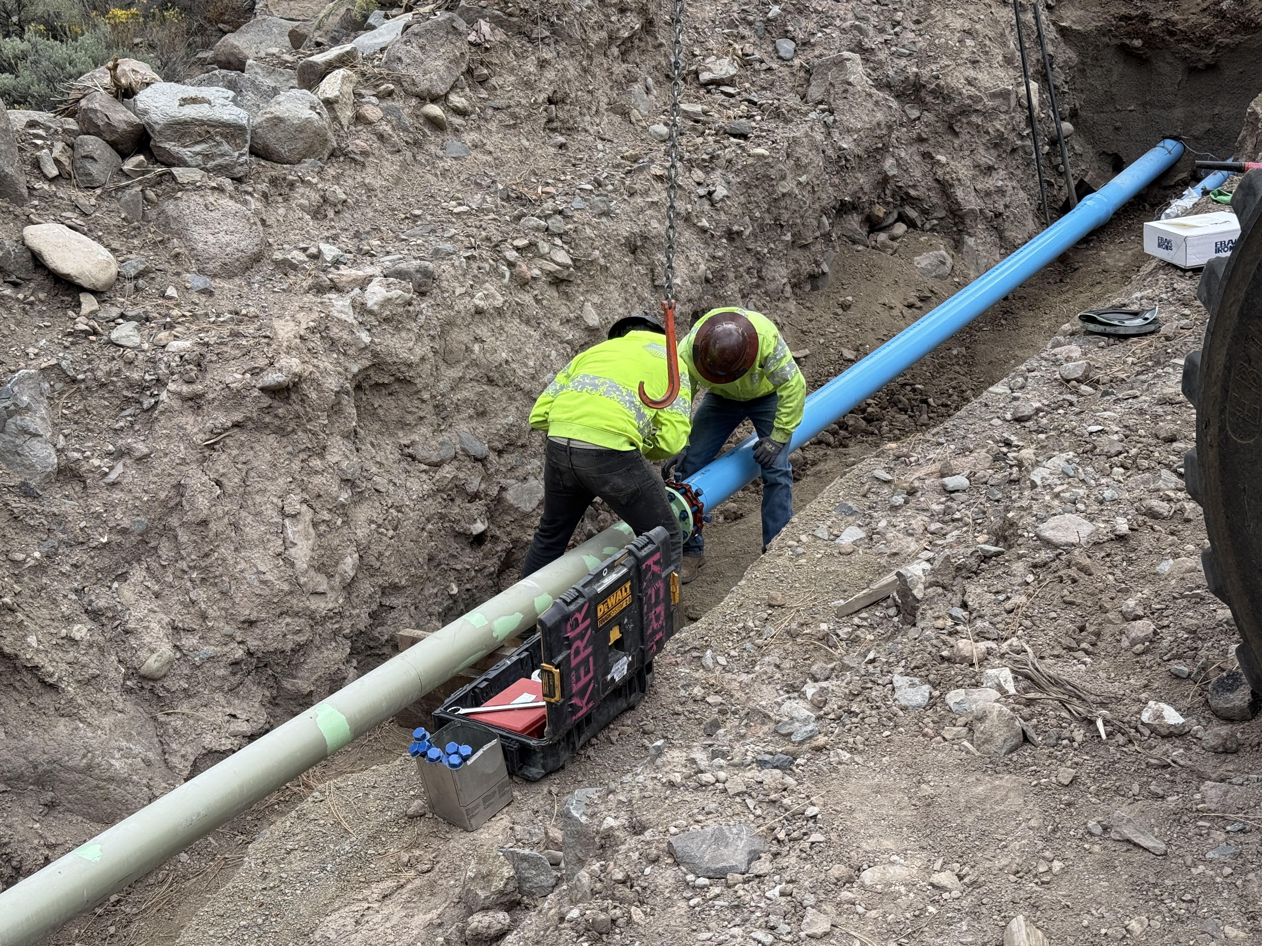 Two workers in high-visibility clothing and hard hats are placing a blue pipe into a trench. The trench is surrounded by uneven, rocky soil, and a toolbox with various equipment is nearby. The blue pipe extends partially across the trench and another is being aligned for connection. The work area shows active placement and alignment of pipeline sections.