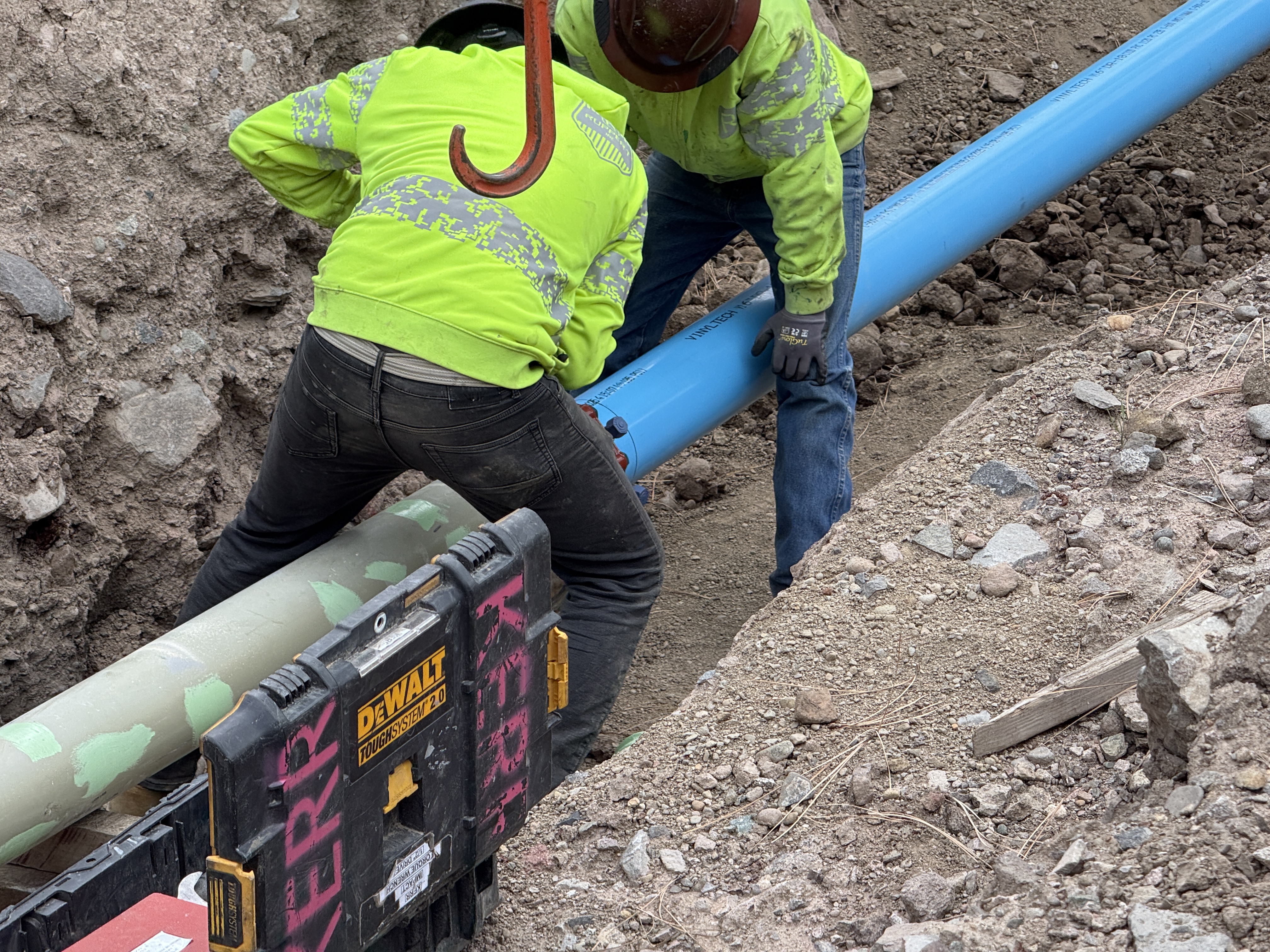Two workers are positioned in a trench connecting or positioning piping materials. They wear hi-vis clothing and hard hats. A large blue pipe is prominently placed in the trench, indicating ongoing piping work. A yellow and black tool box is visible near the trench edge. The trench is surrounded by rocky and uneven ground.