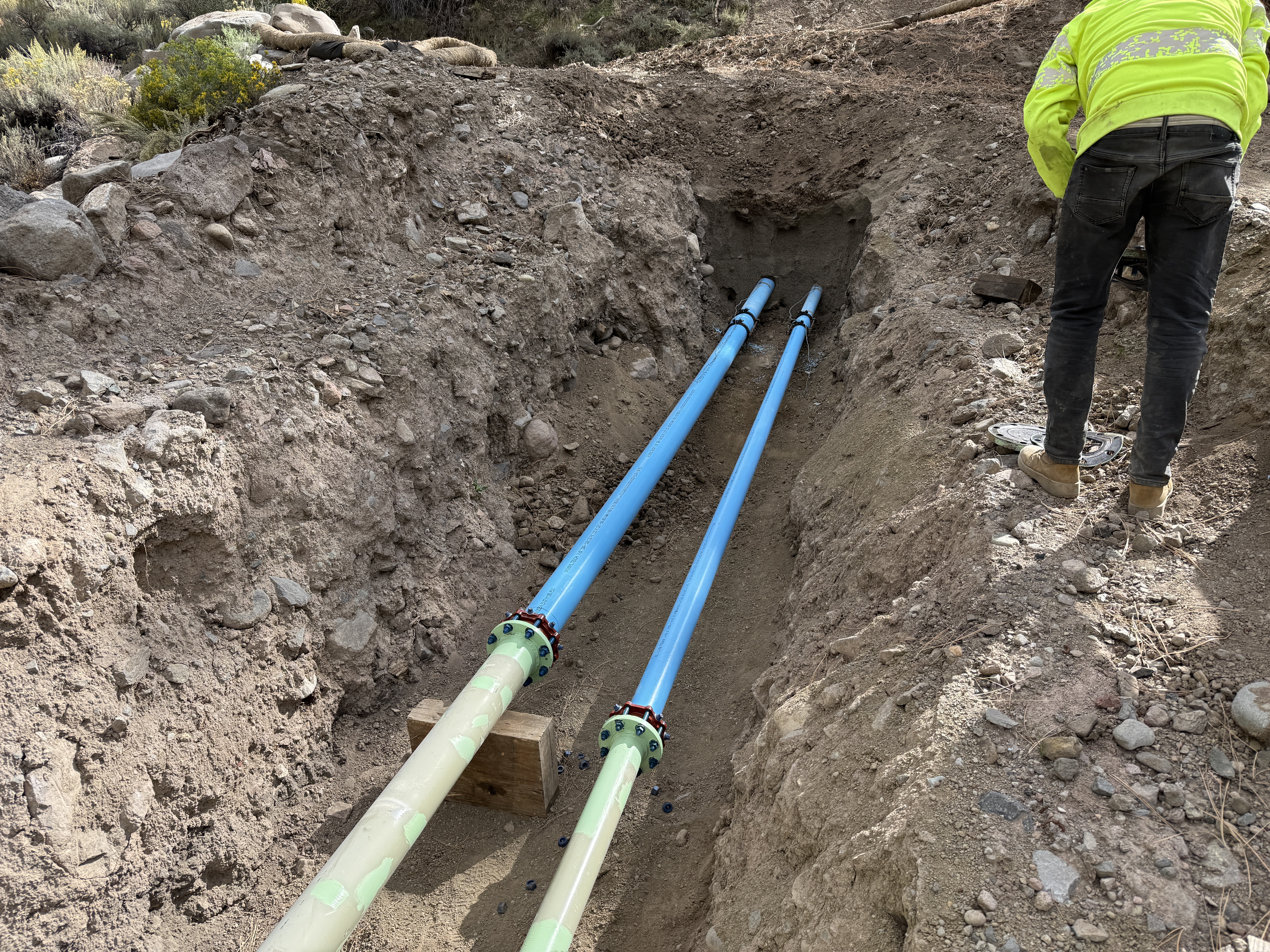 The image shows an open trench with three visible pipes being installed, two of which are blue and one is beige. The pipes are supported by wooden blocks at intervals. A person in a high-visibility jacket and work boots stands on the edge of the trench. The surrounding area is composed of loose soil and rocks.