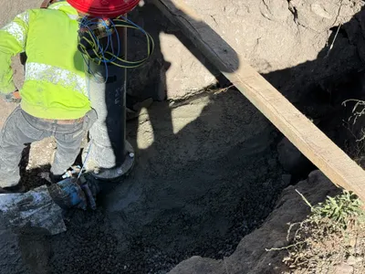 Only personal protective equipment is visible; no additional safety features like barriers or trench boxes are visible.