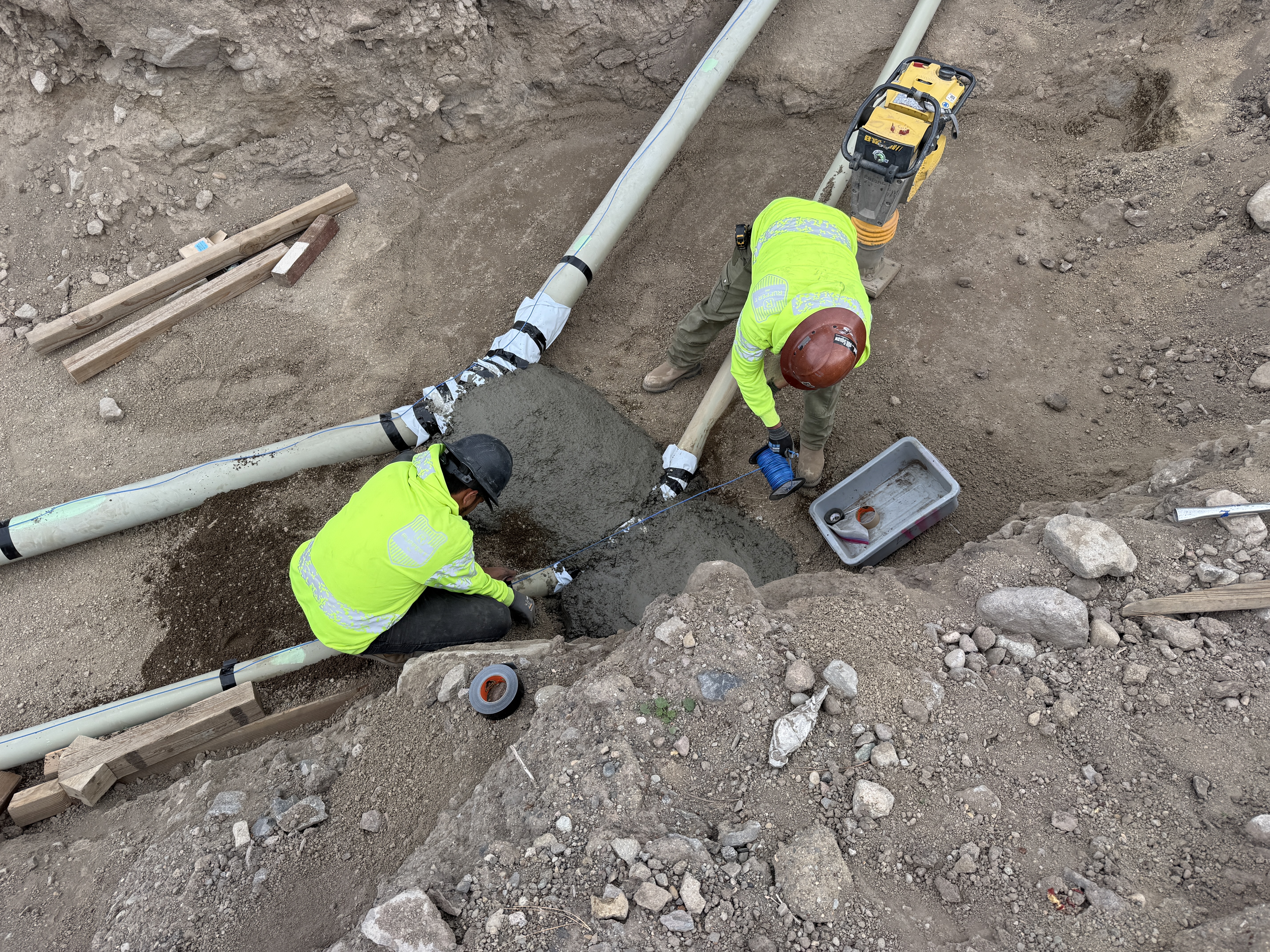 Two workers inside a trench are handling pipes with joint tapes visible at connections. The area around the pipes shows fresh concrete, and there is loose soil surrounding the work. Workers are wearing PPE, and one is using a compaction tool near the pipe. The environment indicates active trench work involving pipe installation or maintenance.