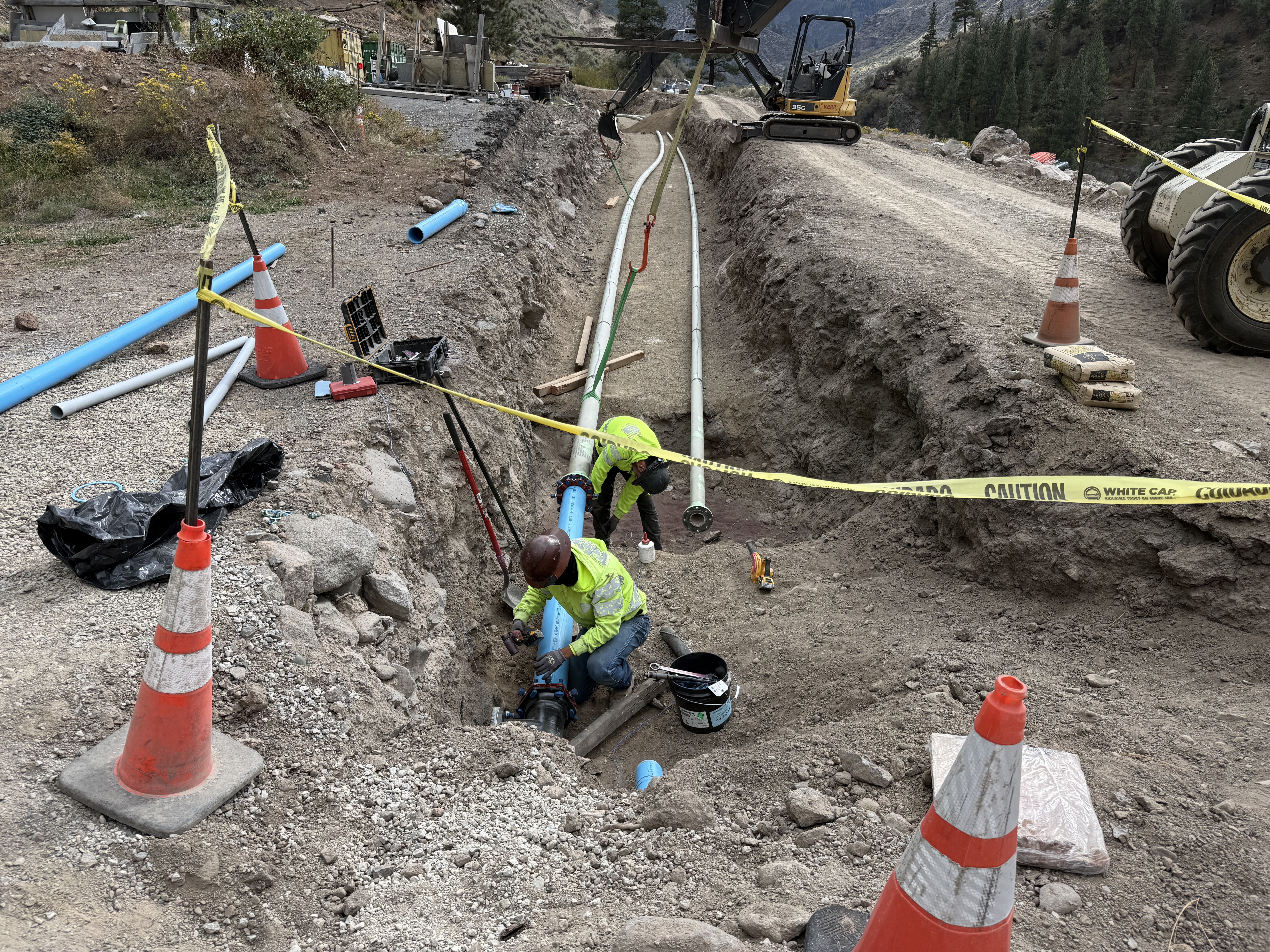Two workers are inside an open trench working on pipeline installation. Blue and white pipes are visible along with a small excavator in the background. There are caution tapes and cones marking the site perimeter. Construction tools are scattered around the trench, indicating active work.