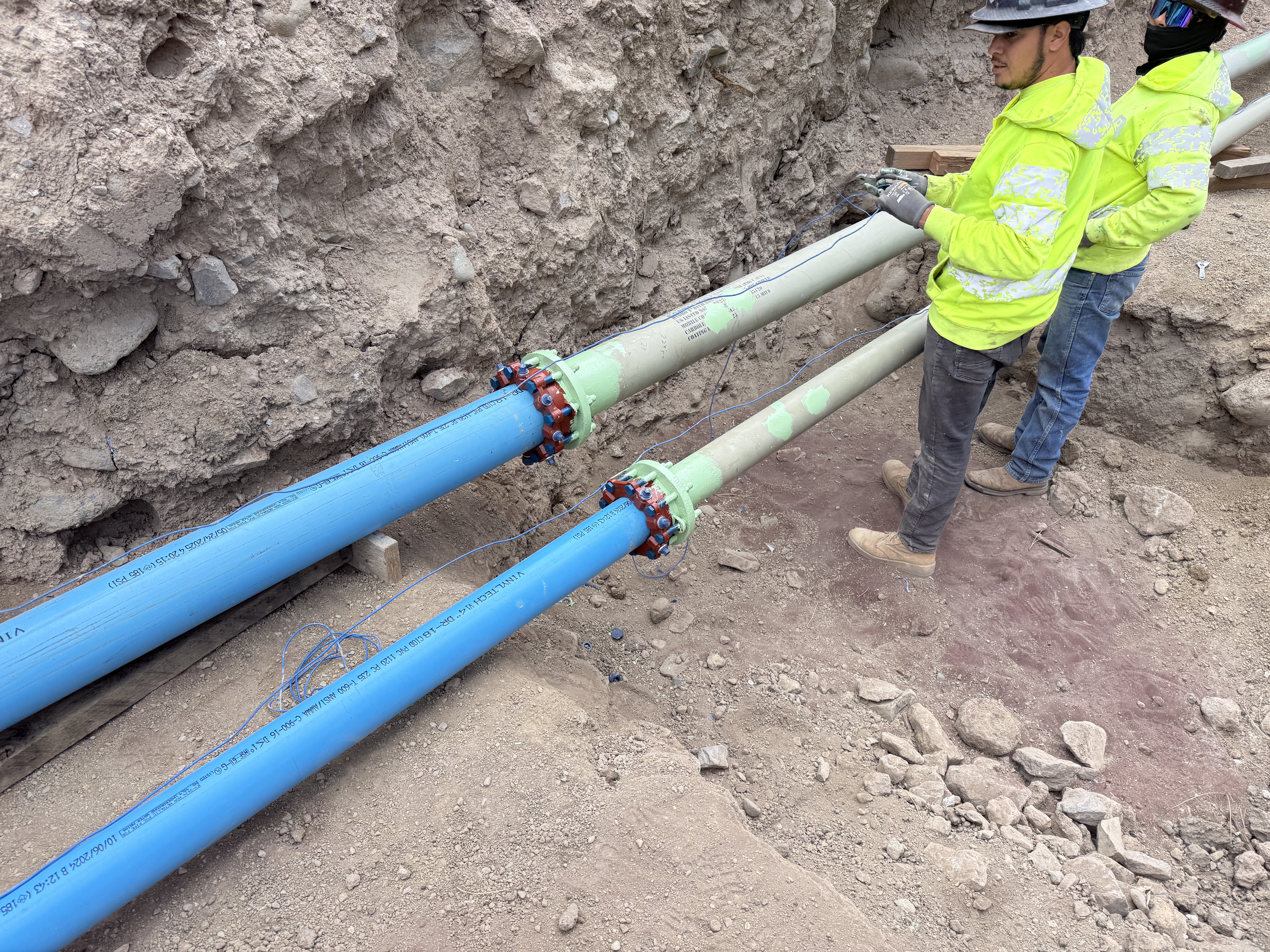 The image shows a trench with two parallel pipelines; one is blue and the other is green. Two workers wearing hard hats and hi-vis jackets are inspecting or working on the pipes. The pipes are supported by wooden blocks, and there is visible wiring or cabling attached to them. The trench walls are earthen and display an uneven, rocky surface.