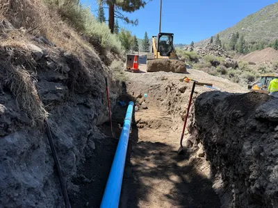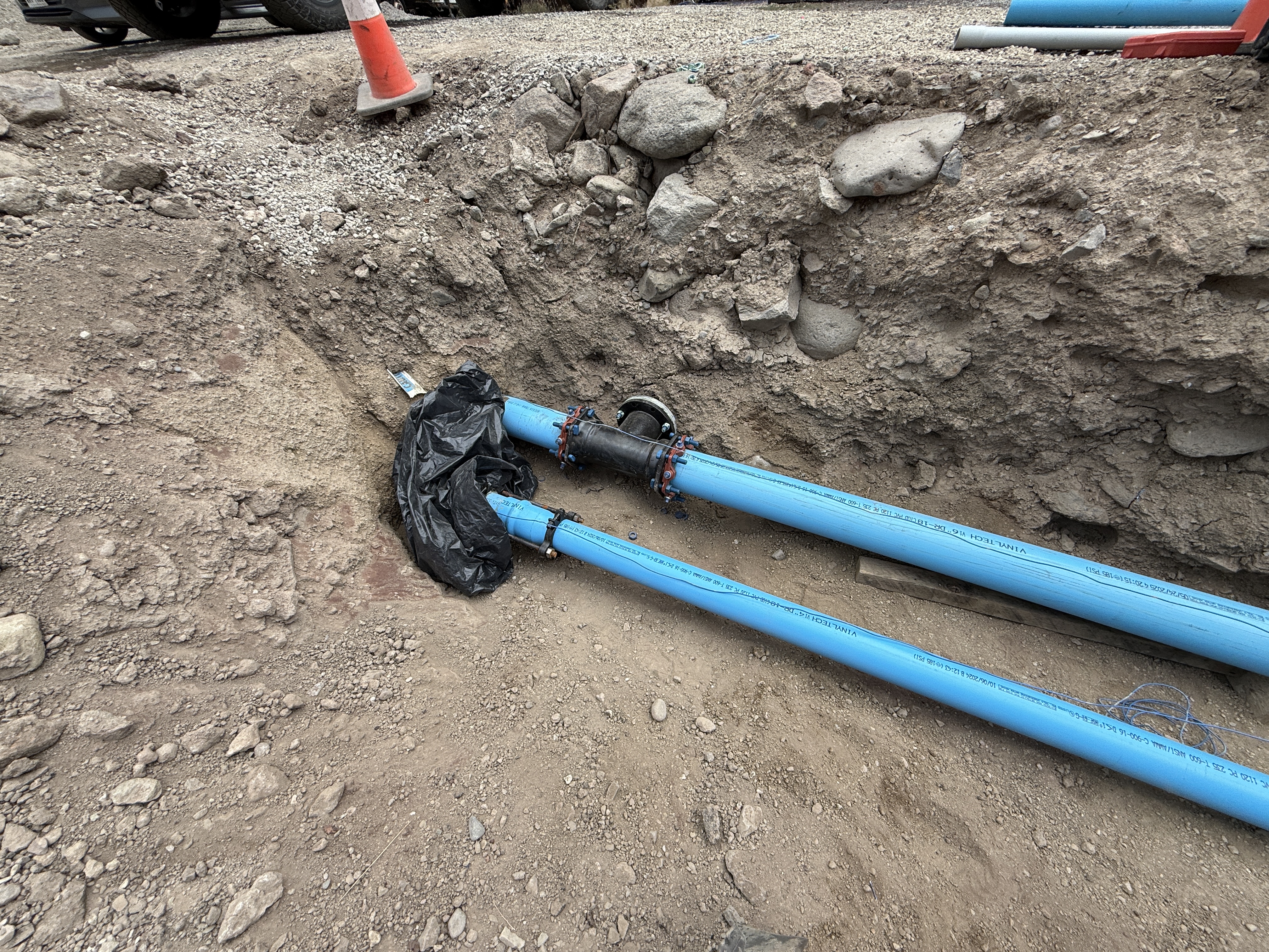 The image depicts a trench with two blue pipes laid side by side, with a connection points visible wrapped in a black material. The pipes rest on the bare earth inside the trench, which is surrounded by soil and rocks. An orange traffic cone is visible, marking the area.