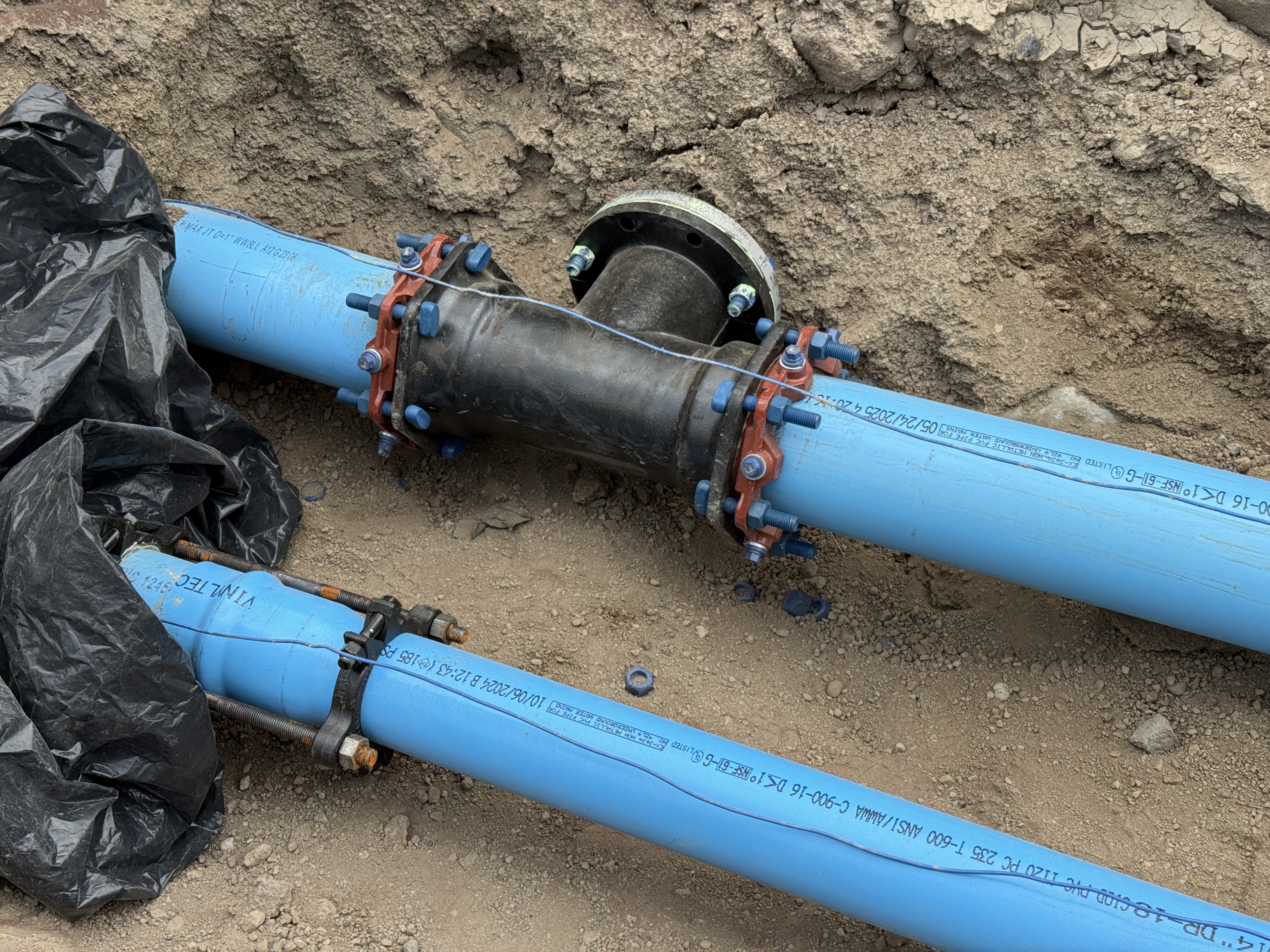 The image captures a pipeline installation where blue pipes are joined together with connectors using bolts and nuts. The pipes are laid in a trench with surrounding soil visible. Black plastic sheeting is partially covering one of the pipes, and pipe joints are visible. The area appears carefully prepared for connecting sections of the pipeline.